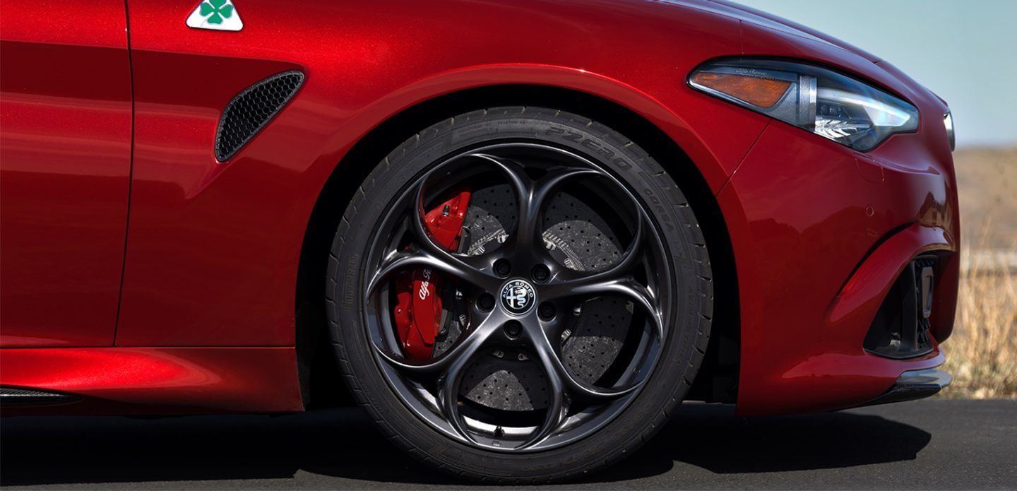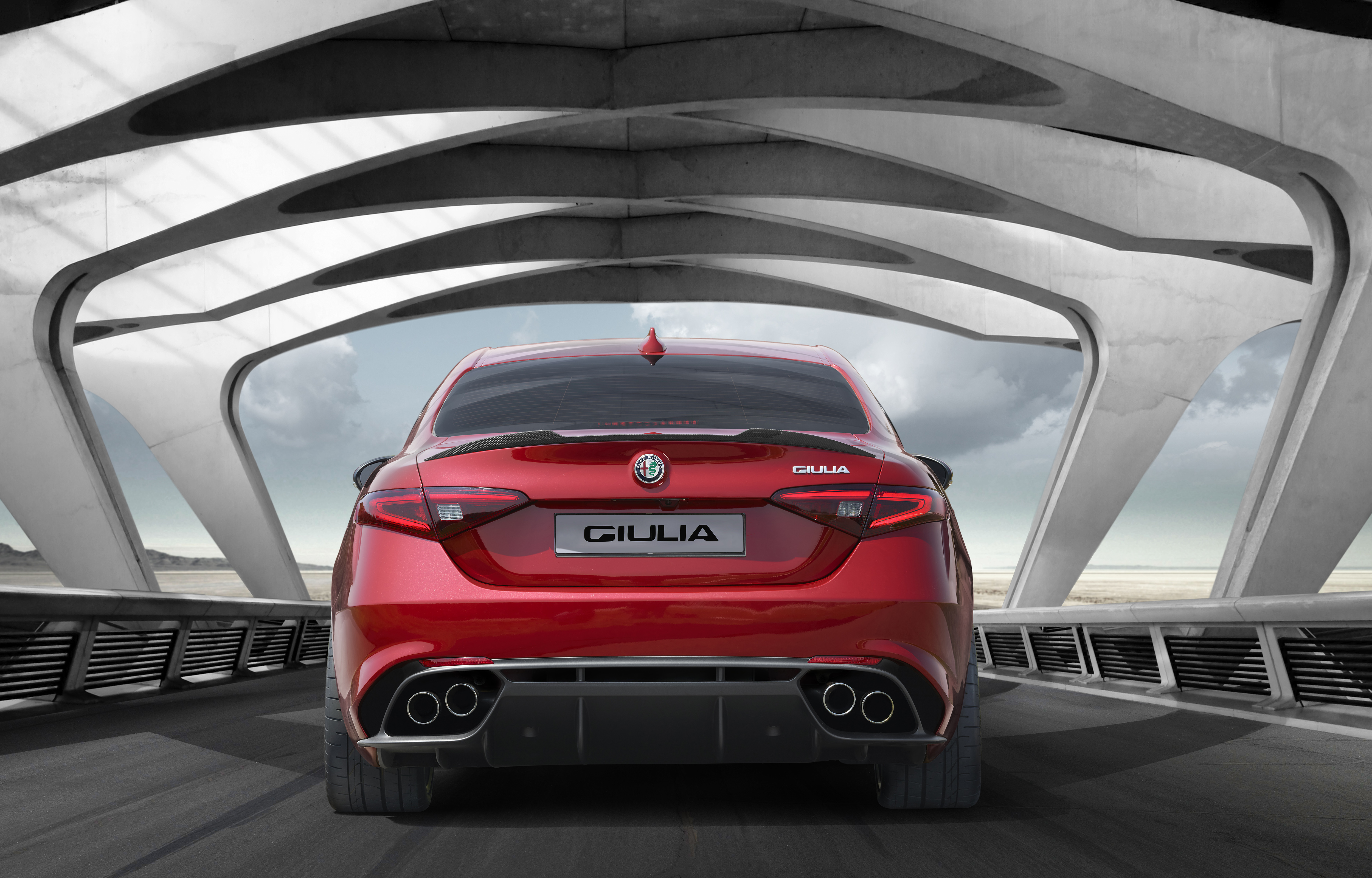 A dinâmica própria do Giulia Quadrifoglio explica-se também pela multifacetada suspensão Alfa™ Link, sendo que a suspensão da frente é de duplo braço com eixo de direção semivirtual e a suspensão traseira é de quatro braços e meio. A suspensão dianteira tem a particularidade de manter as rodas dianteiras em posição perfeitamente perpendicular ao solo (uma característica da competição automóvel), dando um movimento mais linear da direção em 20% e tornando o carro menos subvirador, enquanto que a suspensão traseira confere uma enorme estabilidade em curva e, com isso, um conforto muito maior. Outra característica indispensável é o sistema de vectorização de binário que assegura uma ótima distribuição do binário entre as rodas traseiras graças ao diferencial de controlo eletrónico de duas embraiagens. Este sistema funciona de modo a que o carro ganhe tração suplementar em pisos de estrada mais degradados e em curva, tornando-o mais seguro de conduzir nos limites de aderência. Em termos aerodinâmicos, o splitter dianteiro em fibra de carbono, denominado de Active Aero, está localizado mesmo por baixo do para-choques dianteiro, e ativa-se a partir dos 100 km/h graças a dois atuadores controlados pelo Alfa™ CDC (Chassis Domain Control), gerando 100 kg de força descendente a 300 km/h. Graças a este sistema de aerodinâmica ativa, o coeficiente vertical descendente (Cz) é de -0,1. O difusor traseiro (onde encaixam as ponteiras de escape), a exemplo dos restantes elementos estilísticos, não peca por exagero e encaixa na perfeição na zona por debaixo do parachoques traseiro, ajudando à estabilidade do carro a alta velocidade. Os travões são compostos de discos autoventilados de cerâmica com êmbolos de grandes dimensões. As belas jantes de liga leve e peso baixo, cujo típico estilo Alfa foi refinado, são de 19”.