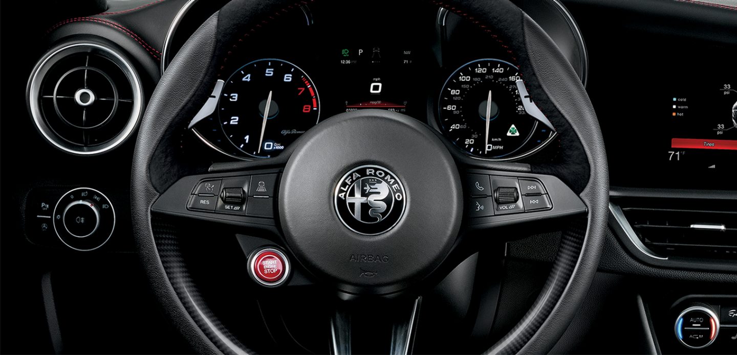 O interior reflete na perfeição o foco na relação simbiótica entre o condutor e o carro num ambiente de superdesportivo. O volante é forrado a pele, com uma aplicação parcial em fibra de carbono, contendo mesmo junto ao centro um botão vermelho de ignição do motor, e outros botões funcionais na trave do volante. Os bancos dianteiros, forrados em pele, oferecem excelentes níveis de conforto e sustentação lateral, existindo ainda a opção pelos bancos de pele em forma de bacquet fabricados pela Sparco, com estrutura base em fibra de carbono. A posição de condução é ideal para a condução desportiva, complementando-se através dos pedais de alumínio. A moldura do painel de instrumentos é composta de fibra de carbono. Todo o restante tablier é forrado a pele, com exceção da consola central que é composta de fibra de carbono, enquanto que vários botões e as entradas de ventilação contém aplicações em cromado. O sistema de infoentretenimento de nova geração é munido de ecrã tátil de alta resolução de 6,5″ com ligação ao Bluetooth, ao USB e aos comandos no volante. Como opcional, está disponível o sistema de infoentretenimento avançado Connect 3D Nav 8.8″, com Radiodifusão Digital (DAB) e painel de instrumentos a cores TFT de 7″. O Novo Giulia Quadrifoglio propõe ainda o Sound Theatre by Harman Kardon com 900 W de potência e 14 altifalantes, incluindo dois altifalantes surround e um subwoofer.