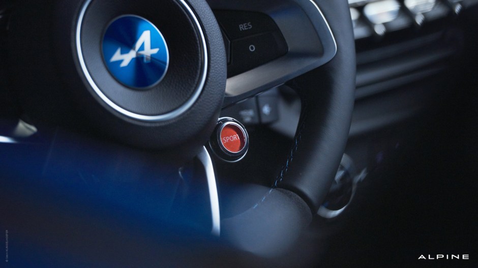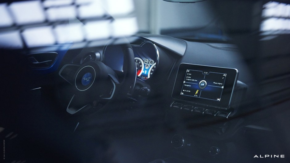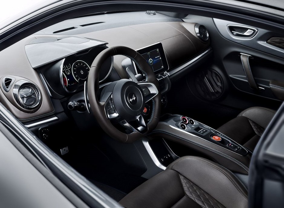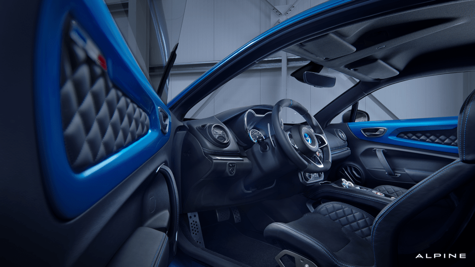 O interior revela o cuidado no detalhe, conferindo ao bólide desportivo francês o carácter atlético, com pormenores metálicos de essência desportiva que conjugam com o revestimento dos dois bancos desportivos, consola central, tablier e volante em couro, cozido em linha de cor azul a condizer com a carroçaria do carro. Pelo facto do centro de gravidade não ser demasiado baixo, a acessibilidade ao cockpit fica facilitada para qualquer pessoa que queira viajar com um nível francamente aceitável de conforto. O centro do volante denuncia a sua origem: trata-se de um Alpine verdadeiro!