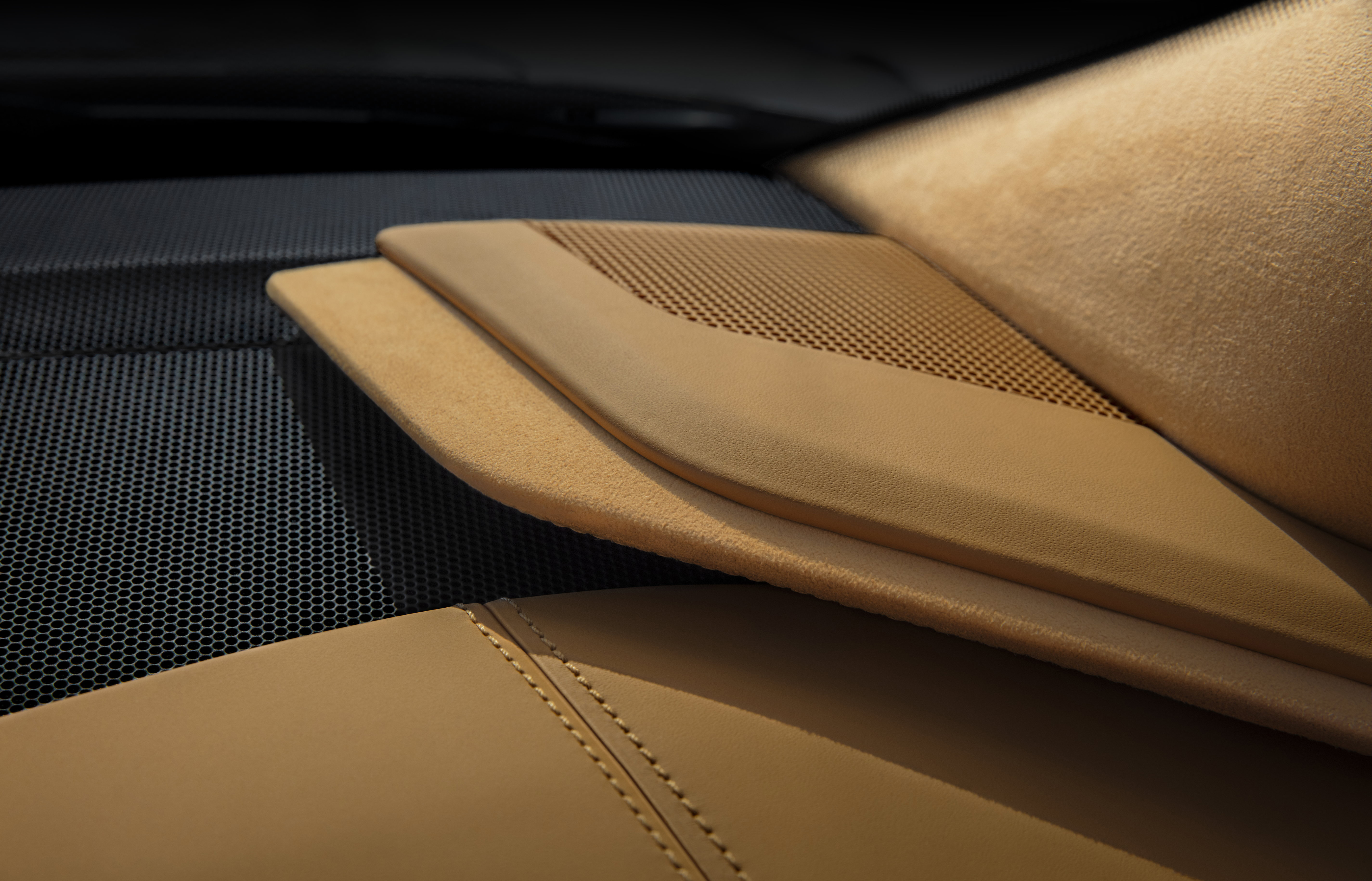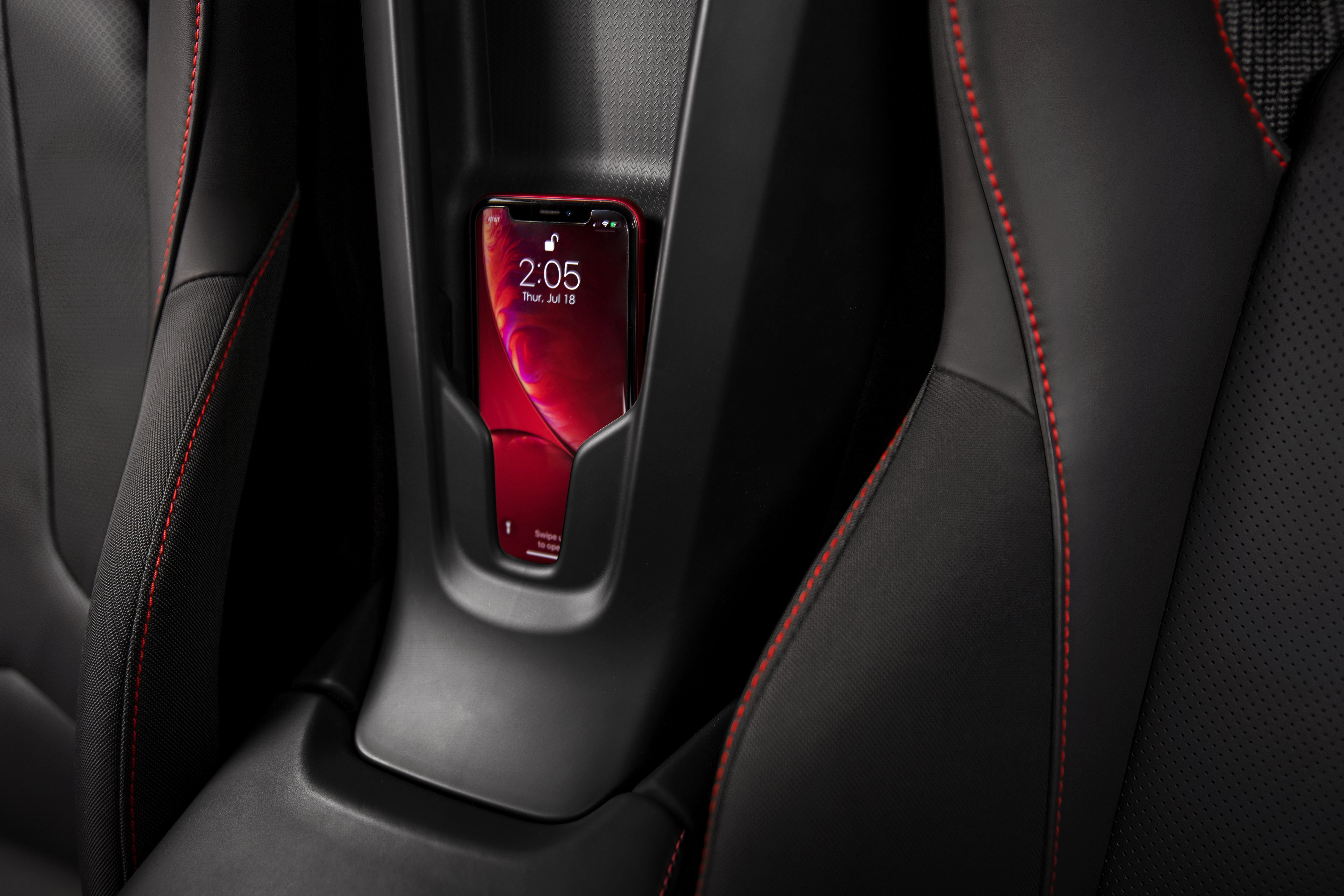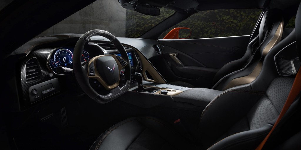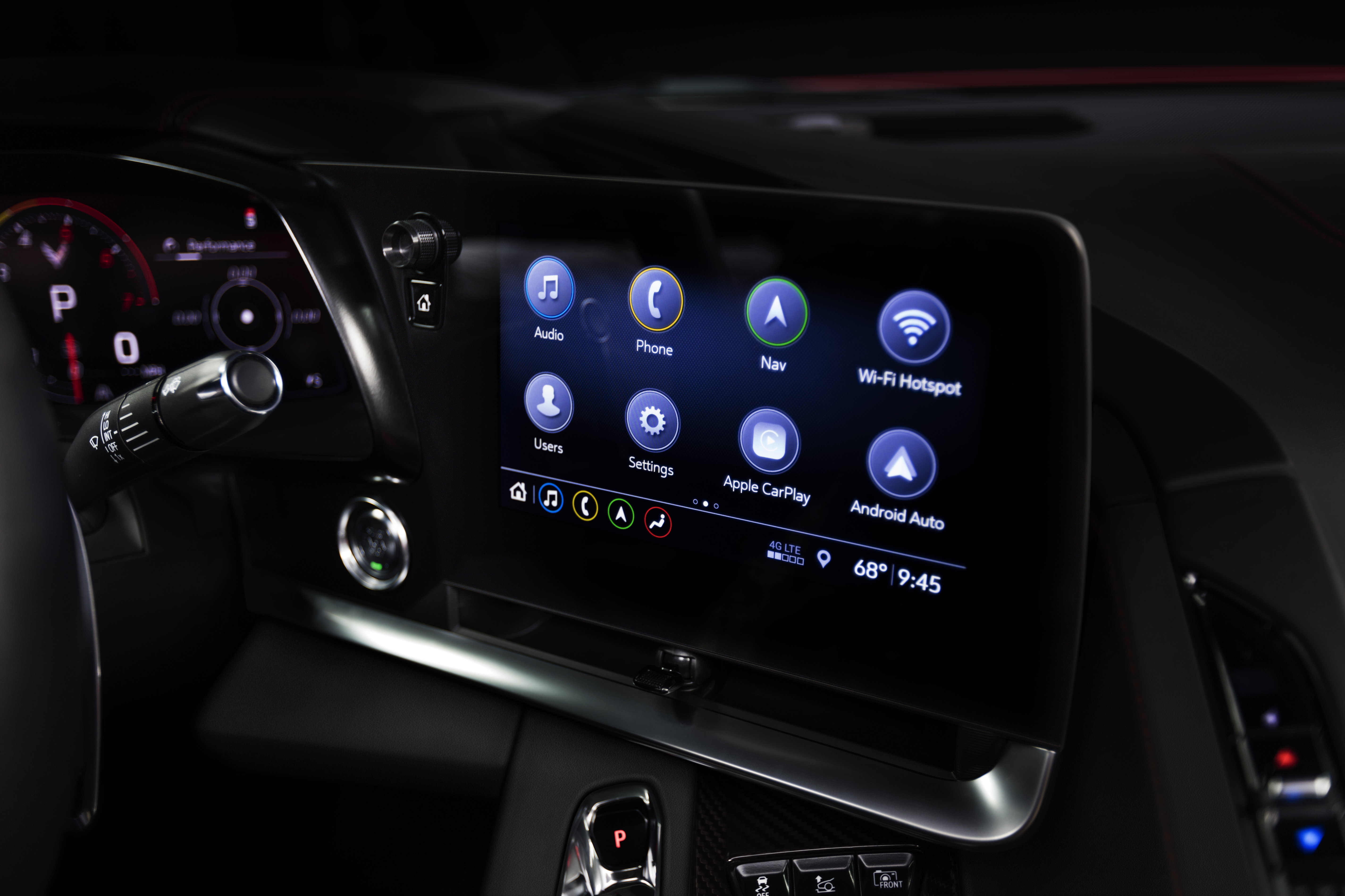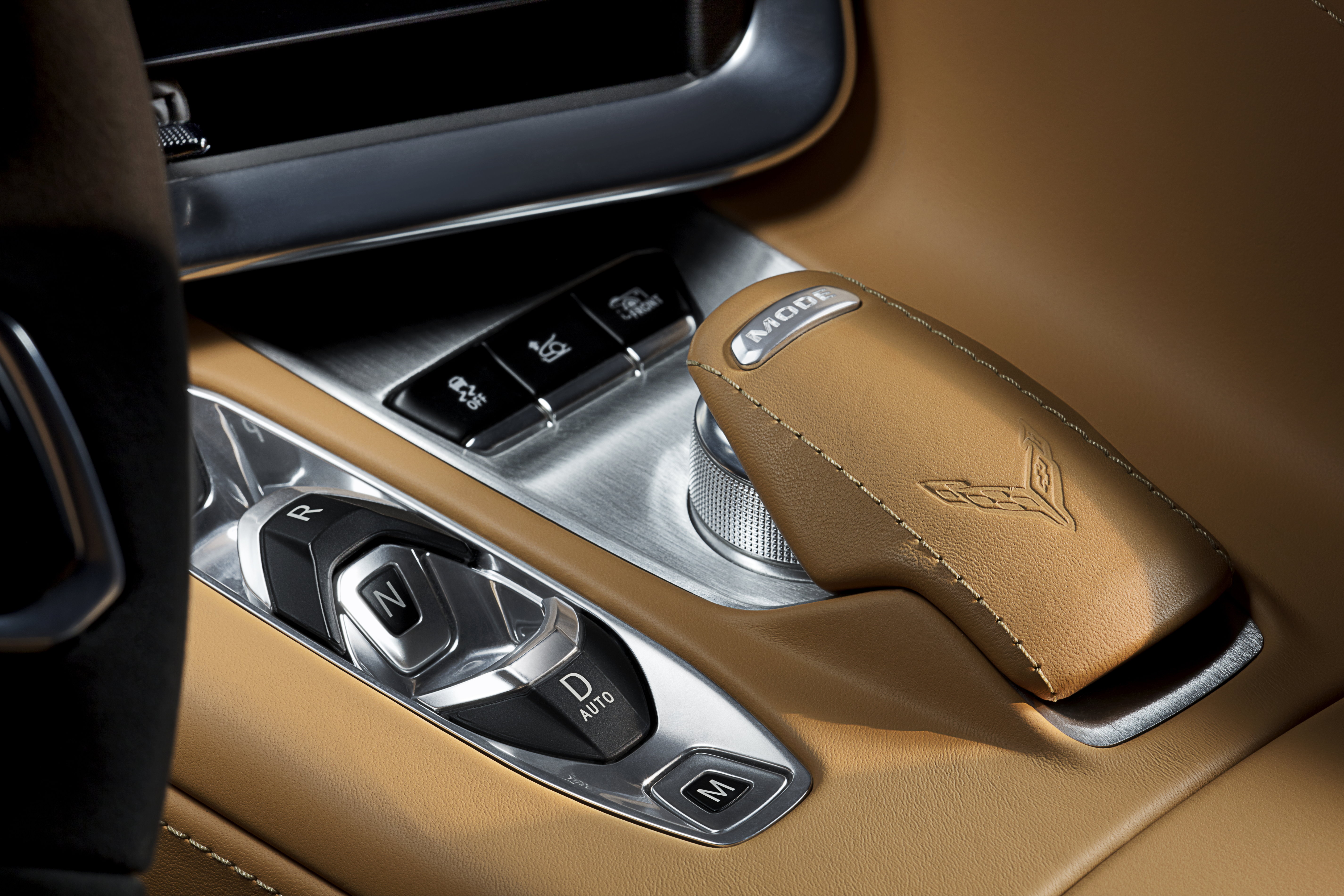 Design, luxo e tecnologia são temas dominantes do interior do novo Corvette Stingray. Nem parece que se trata de um carro americano! No interior sobressai a enorme consola central que proporciona duas zonas de segurança distintas, uma para o condutor e outra para o passageiro, com especial ênfase para o papel do condutor. Na extremidade da consola central existe uma enorme fila de botões que comandam diversas funções de climatização, o que juntamente com as aberturas finas de ventilação cria um interior baixo e espaçoso, minimizando o painel de instrumentos que é inteiramente digital e apresenta uma excelente definição gráfica, juntamente com o ecrã de infoentretenimento de 12 polegadas, cujo sistema, ao nível dos melhores, é totalmente novo e bem mais intuitivo que o anterior, destacando-se bem graças às dimensões reduzidas do novo volante Corvette de dois raios, podendo ainda ser comandado ao toque dos dedos ou por botão rotativo, ao estilo dos que estão presentes em carros da Mercedes e da Aston Martin. Uma enorme porção do interior (volante incluído) é forrada de modo artesanal em couro de soberba qualidade, conjugando com pequenas porções revestidas em fibra de carbono e metal polido, cujo aspeto pode conter seis padrões de cor à escolha: “Jet Black”, “Sky Cool Gray”, “Adrenaline Red”, “Natural/Natural Dipped”, “Two-Tone Blue” e “Morello Red”. Os bancos, de design focado especialmente para o conforto e para o excelente apoio lateral, apresentam três configurações à escolha: “GT1”, com acabamento em couro Mulan, que privilegia o conforto e oferece um bom apoio nas curvas; “GT2”, mais inspirada nas corridas, com guarnição em fibra de carbono, uma inserção de couro Napa, almofadas de couro Mulan, encosto pintado de preto, apoio lombar nos dois sentidos, ajuste de asa e sistema de aquecimento e de ventilação; “Competition Sport”, claramente indicada para uma pilotagem ao nível dos track days, que inclui reforços agressivos, superfícies integrais dos assentos em couro Napa, acabamento em fibra de carbono no apoio da cabeça, sistema de aquecimento e de ventilação, e um novo tecido extremamente durável, inspirado nos coletes Kevlar. A completar o ramalhete do interior, estão as belíssimas colunas de som Bose revestidas de metal, uma delas na zona central entre os encostos dos bancos. Existem alguns espaços ergonómicos para arrumos, entre os quais um compartimento útil para um smartphone.