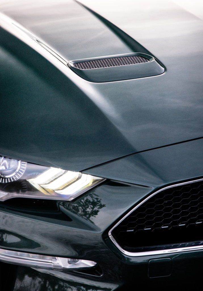 A nova edição de tributo ao filme Bullitt tem as formas básicas, exclusivamente em formato coupé, e praticamente todo o equipamento do atual Ford Mustang Fastback 5.0 V8 GT. Contudo e a exemplo das anteriores gerações de tributo e ao próprio modelo original, “deixou o cavalo no estábulo”, sendo que a grelha frontal é completamente sombria, rodeada de uma linha cromada, tal como as bordas das janelas laterais. Na zona traseira do veículo e no centro do volante, por vez do badge do Mustang está patente um desenho de uma personificada mira com o inconfundível lettering “BULLITT” no centro da mesma. No interior, a inscrição “BULLITT” aparece também na zona superior do tablier do lado do porta-luvas (placa com número de série do modelo) e na zona debaixo das duas portas de acesso ao habitáculo. Ainda assim, o distinto cavalo – apenas para nos lembrar de que se trata de um Mustang – aparece em fundo preto no centro das negras jantes desportivas de 19 polegadas com cinco raios, as quais evocam o estilo utilizado no Mustang original que foi a estrela do filme. O Bullitt está disponível em duas cores, Preto Shadow e o popular Verde Dark Highland que foi mostrado no filme, e também nos tributos anteriores. Não menos importante: o desenho dos farolins na atual geração é o que indispensavelmente ajuda a realçar o tributo face ao modelo original, dada a semelhança verificada em ambas as gerações. Exteriormente, são também visíveis as pinças pintadas em vermelho, cujo poderoso sistema de travagem é fornecido pela Brembo. As aberturas no capô de motor do Mustang, replicadas nesta versão Bullitt, não podiam deixar de marcar presença, assim como o splitter dianteiro, as saias laterais e o difusor traseiro que prestam a ajuda necessária à aerodinâmica do veículo.