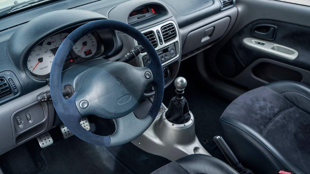 No geral o interior mantém praticamente o mesmo aspeto visto no Clio Renault Sport 172, com as diferenças marcadas pelo aumento da altura da avalanca da caixa de velocidades (de base mais elevada), pelo revestimento prateado do separador central onde assenta a dita alavanca, pelos pedais de alumínio exclusivos e pela ocupação do motor no local dos habituais bancos traseiros, cuja área está devidamente protegida por um caixilho próprio com dupla tampa, cuja abertura depende sempre do acesso ao mesmo pela porta traseira da habitual bagageira das versões convencionais. Ou seja, à parte destes detalhes exclusivos do V6, em termos de habitabilidade nos bancos da frente não há qualquer diferença para qualquer outra versão Clio; tal como no Clio Renault Sport 172, o tecido Alcantara marca presença em quase todo o aro do volante, na zona central dos bancos (onde está presente a inscrição “Renault Sport” em modo de costura) e na zona central das guarnições das portas laterais; a base do volante e a restante área dos bancos é revestida em pele; até o painel de instrumentos de fundo branco é exatamente igual ao do Clio Renault Sport 172, assim como o punho da alavanca da caixa de velocidades, redondinho como a mão direita gosta… Em suma, o interior faz-nos lembrar de que este modelo é de facto um Clio genuíno.