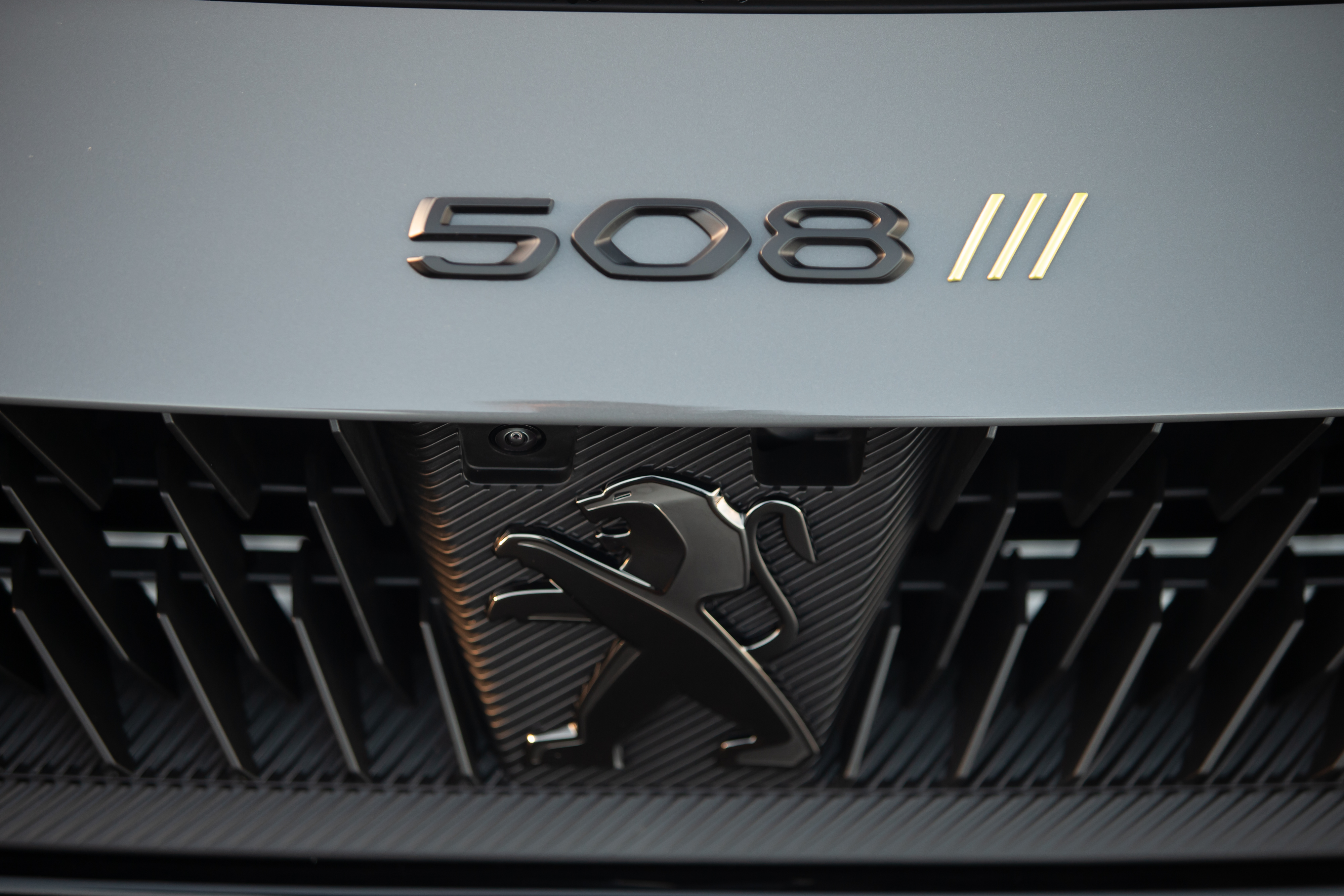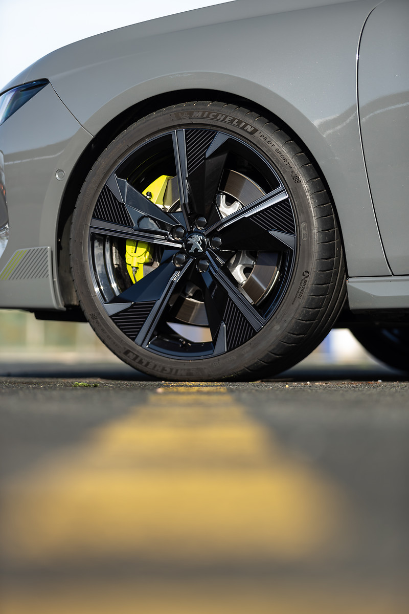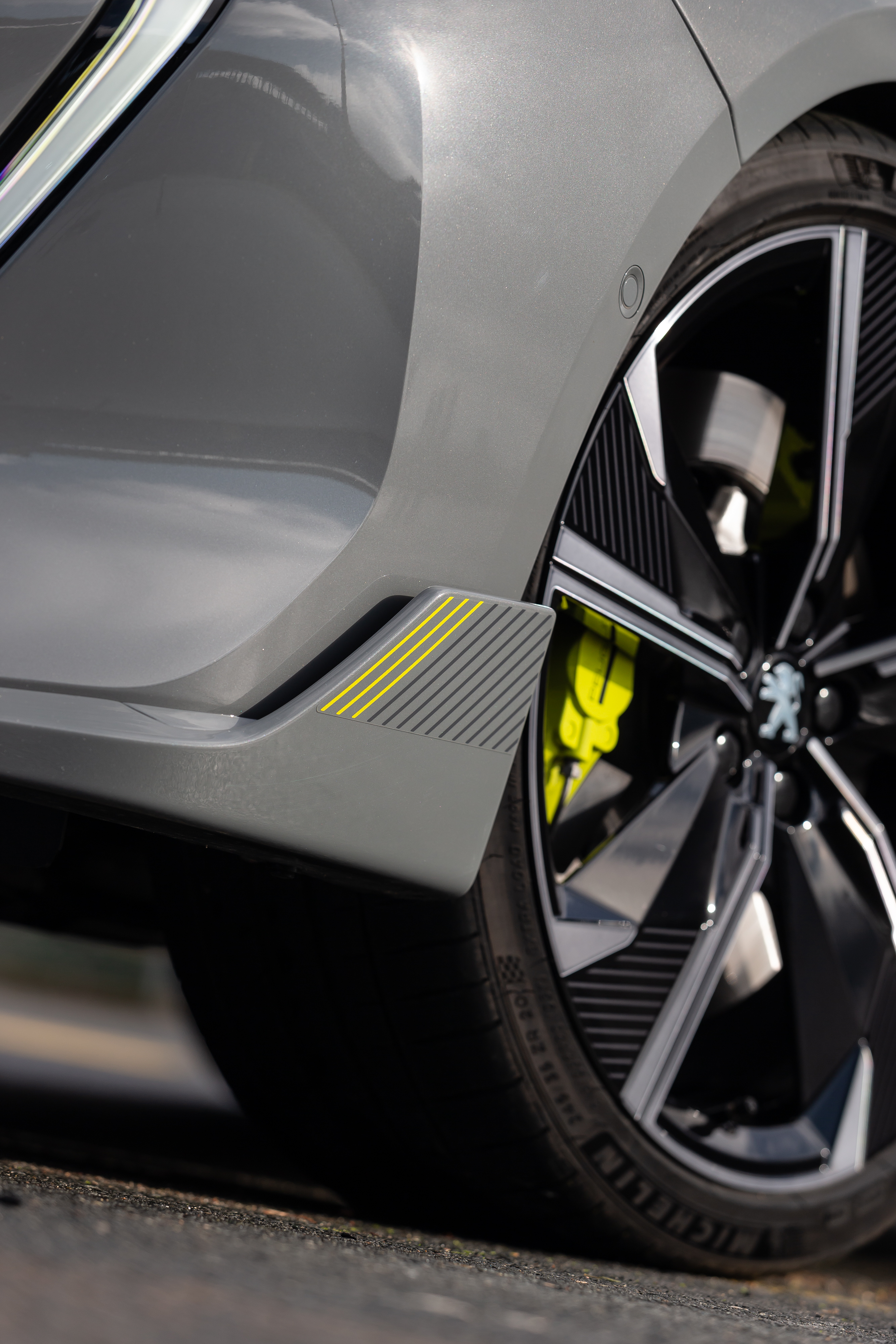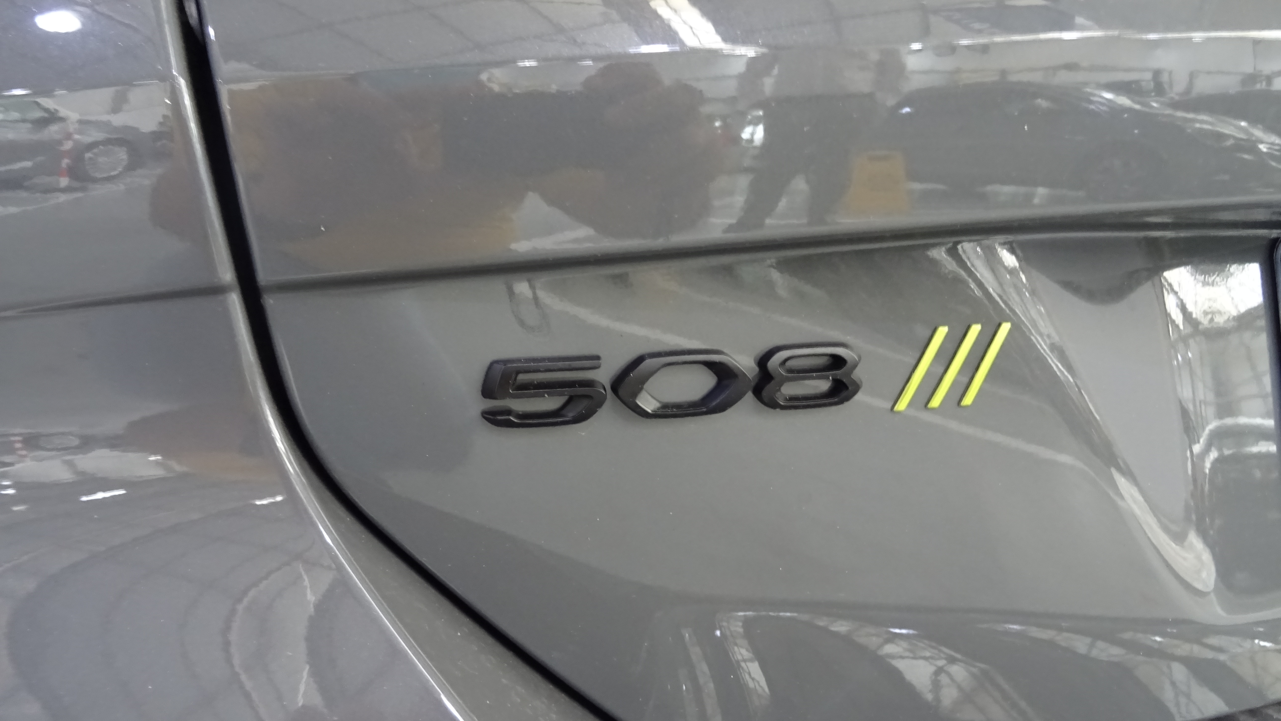 Para começar, o 508 PSE é calçado por belíssimas e estilosas jantes exclusivas EXXAR de 20 polegadas, envoltas por pneus de alta performance Michelin Pilot Sport 4S (curiosamente, o mesmo composto de pneu usado pelo hipercarro Rimac Nevera) de medidas 245/35 R20. As aletas aerodinâmicas com decoração PSE – total de seis – foram colocadas aos pares: nas extremidades do para-choques dianteiro; na zona mais posterior das saias laterais (junto ao eixo traseiro); por fim, na extremidade do para-choques traseiro, onde faz plena comunhão com a peça com acabamento em preto brilhante que executa um papel de difusor traseiro q.b., onde se enquadram perfeitamente as discretas mas sólidas ponteiras de escape, bem como os esguios farolins de marcha-atrás e de nevoeiro. As entradas de ar frontais contêm dois canais específicos com acabamento em verde “kryptonite” brilhante, sendo importantes para uma melhor refrigeração do genial sistema de propulsão (uma verdadeira obra-prima da Peugeot Sport). A grelha frontal contém um design exclusivo da PSE e um acabamento em preto deliciosamente acetinado. Em preto acetinado são também fixados os monogramas “508” – no capô dianteiro logo acima da grelha frontal e na porta da bagageira – que são ladeados à direita pela garra Kryptonite (ou tripla barra) que é o novo símbolo oficial da PSE, símbolo também presente no afunilamento do pilar C com acabamento em preto brilhante sólido (apenas presente na versão de carroçaria sedan). A cor exclusiva deste modelo é a bem escolhida Selenium Grey, mas existem também as opções de cor Perla Nera e Pearl White. Exclusivo é também o desenho das maxilas dos travões dianteiros, pintados com a cor verde “kryptonite”, onde está presente o lettering “PEUGEOT SPORT”.