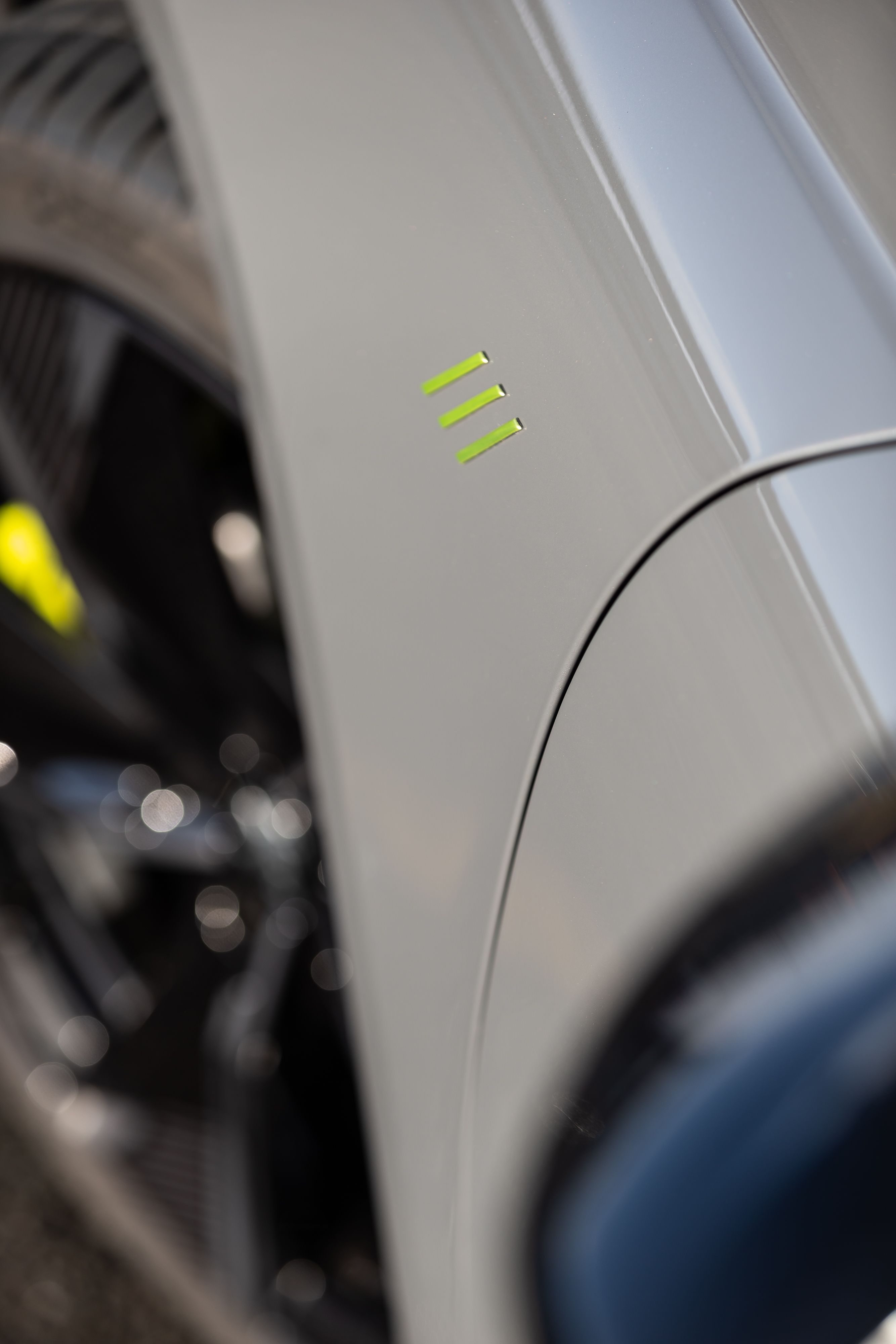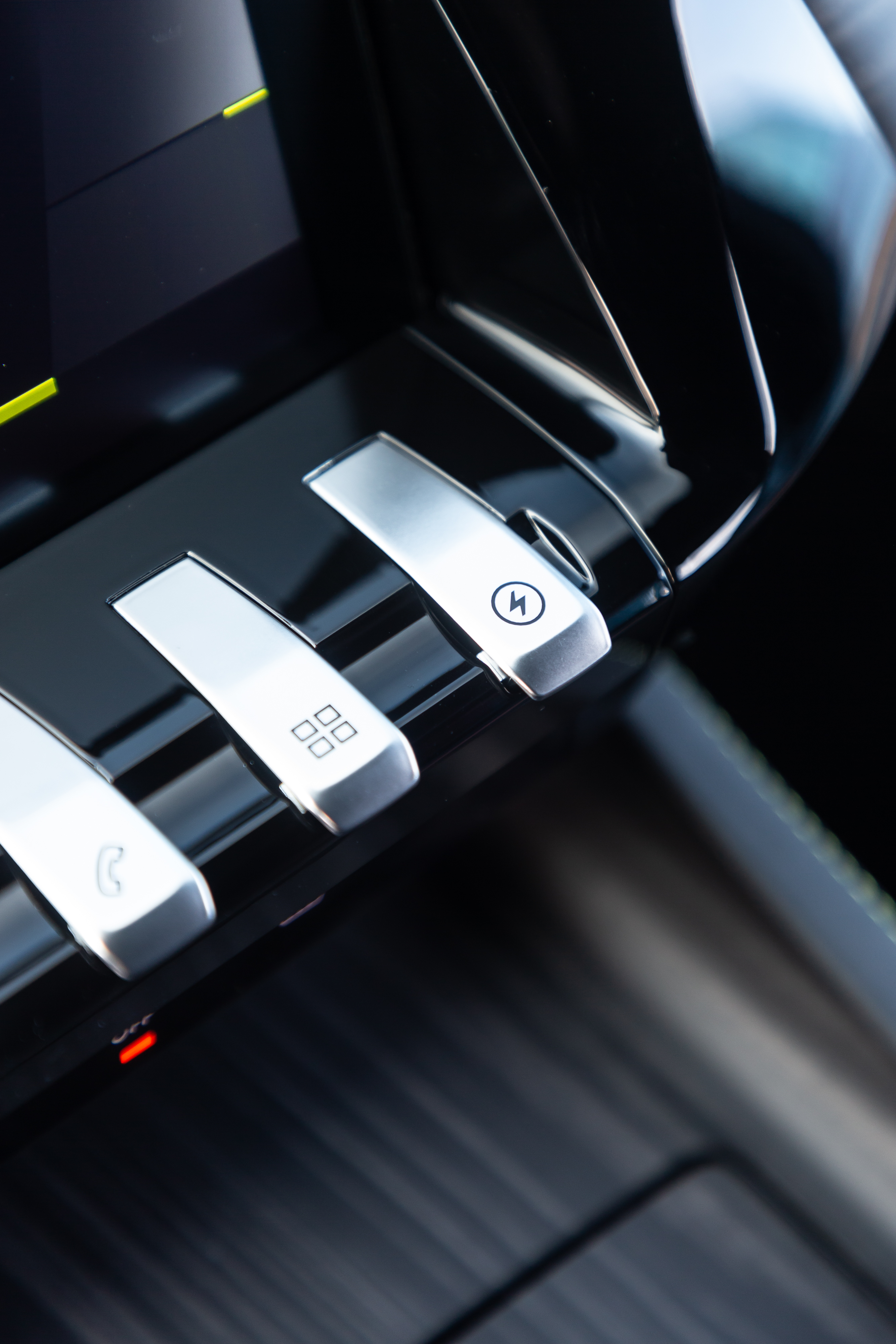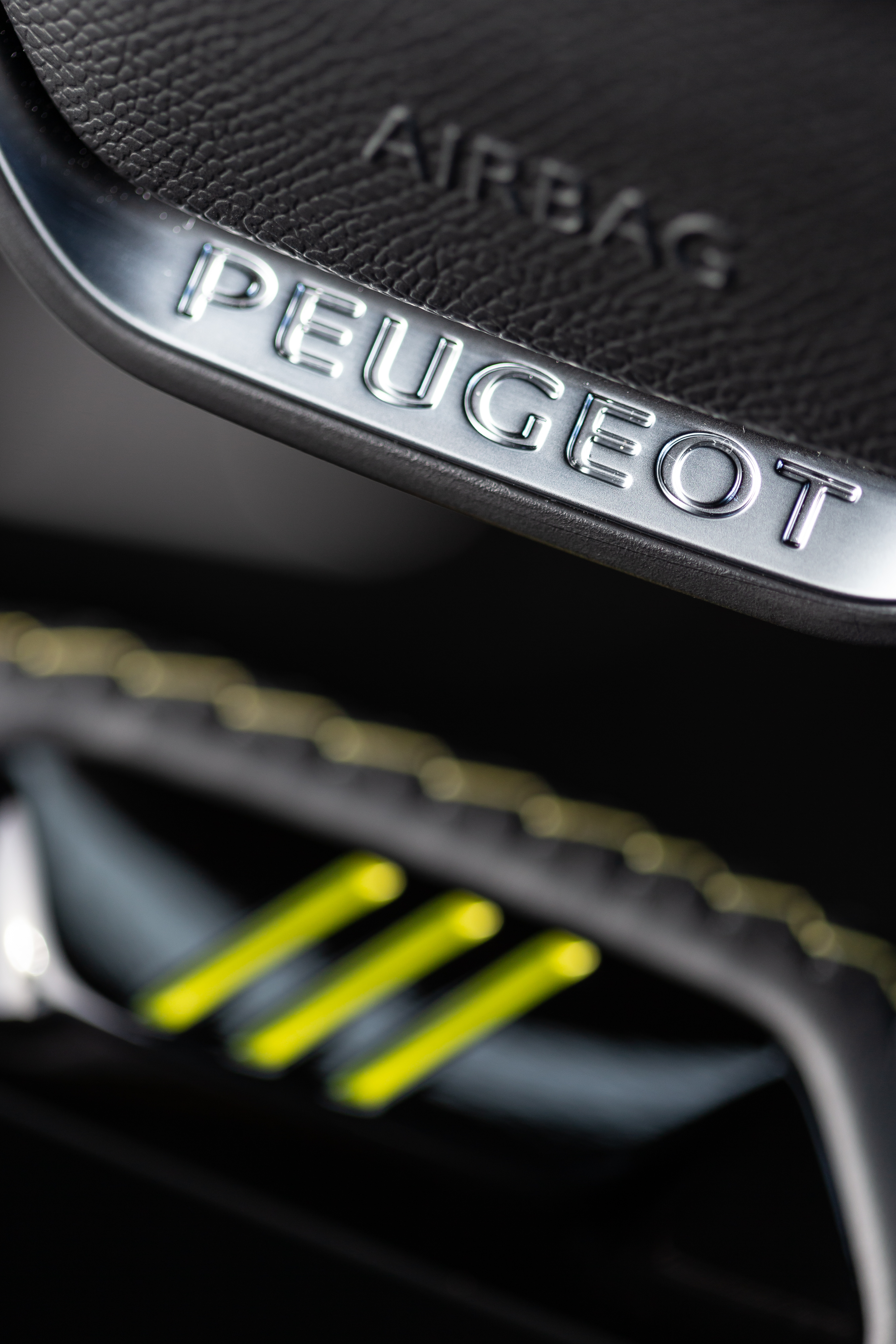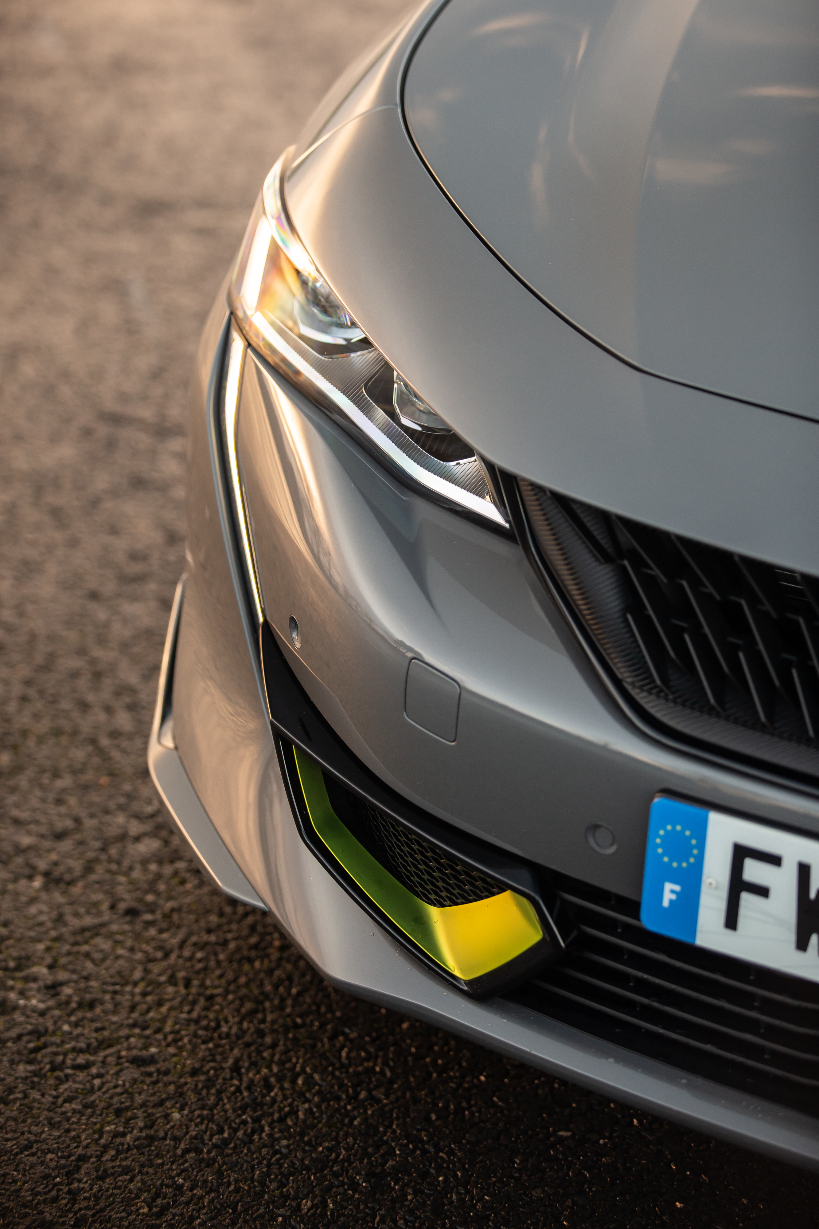 Para começar, o 508 PSE é calçado por belíssimas e estilosas jantes exclusivas EXXAR de 20 polegadas, envoltas por pneus de alta performance Michelin Pilot Sport 4S (curiosamente, o mesmo composto de pneu usado pelo hipercarro Rimac Nevera) de medidas 245/35 R20. As aletas aerodinâmicas com decoração PSE – total de seis – foram colocadas aos pares: nas extremidades do para-choques dianteiro; na zona mais posterior das saias laterais (junto ao eixo traseiro); por fim, na extremidade do para-choques traseiro, onde faz plena comunhão com a peça com acabamento em preto brilhante que executa um papel de difusor traseiro q.b., onde se enquadram perfeitamente as discretas mas sólidas ponteiras de escape, bem como os esguios farolins de marcha-atrás e de nevoeiro. As entradas de ar frontais contêm dois canais específicos com acabamento em verde “kryptonite” brilhante, sendo importantes para uma melhor refrigeração do genial sistema de propulsão (uma verdadeira obra-prima da Peugeot Sport). A grelha frontal contém um design exclusivo da PSE e um acabamento em preto deliciosamente acetinado. Em preto acetinado são também fixados os monogramas “508” – no capô dianteiro logo acima da grelha frontal e na porta da bagageira – que são ladeados à direita pela garra Kryptonite (ou tripla barra) que é o novo símbolo oficial da PSE, símbolo também presente no afunilamento do pilar C com acabamento em preto brilhante sólido (apenas presente na versão de carroçaria sedan). A cor exclusiva deste modelo é a bem escolhida Selenium Grey, mas existem também as opções de cor Perla Nera e Pearl White. Exclusivo é também o desenho das maxilas dos travões dianteiros, pintados com a cor verde “kryptonite”, onde está presente o lettering “PEUGEOT SPORT”.