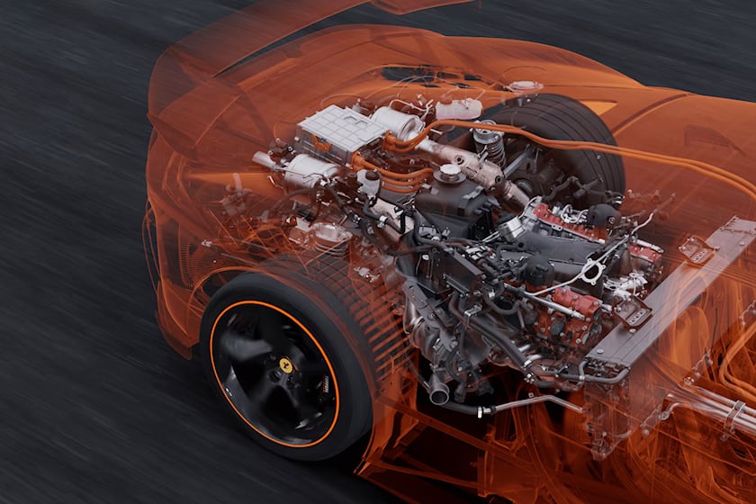 Quanto à motorização elétrica, cujos detalhes técnicos foram já mencionados, tal como no Stradade normal é alimentada por uma bateria de iões de lítio que garante um alcance de 25 km no modo totalmente elétrico (eDrive), pelo qual o motor de combustão se desliga completamente e o carro rola de forma silenciosa para atingir uma velocidade máxima de 135 km/h. Consoante os vários modos de condução comandados pelo seletor eManettino, sempre que o motor de combustão fica ligado, os três motores elétricos são geridos de forma otimizada de modo a fornecer o nível de potência extra necessário para servir de auxiliar generoso do motor V8 biturbo, seja para situações cujo foco seja a eficiência ou situações cujo foco seja o desempenho. Na realidade, são quatro os modos de condução disponíveis: o modo eDrive, pelo qual o motor de combustão interna fica desligado e a tração é direcionada exclusivamente às rodas dianteiras; o modo Hybrid que favorece a depleção da bateria e gere as transições de forma autónoma, maximizando a autonomia totalmente elétrica; o modo Performance, pelo qual o motor de combustão interna mantem-se em constante funcionamento, dando prioridade a um desempenho consistente ao invés de atingir a potência máxima; finalmente, o mais poderoso modo Qualifying, em que toda a unidade motriz liberta a potência máxima, graças à função extra boost que dá total prioridade ao desempenho dinâmico.