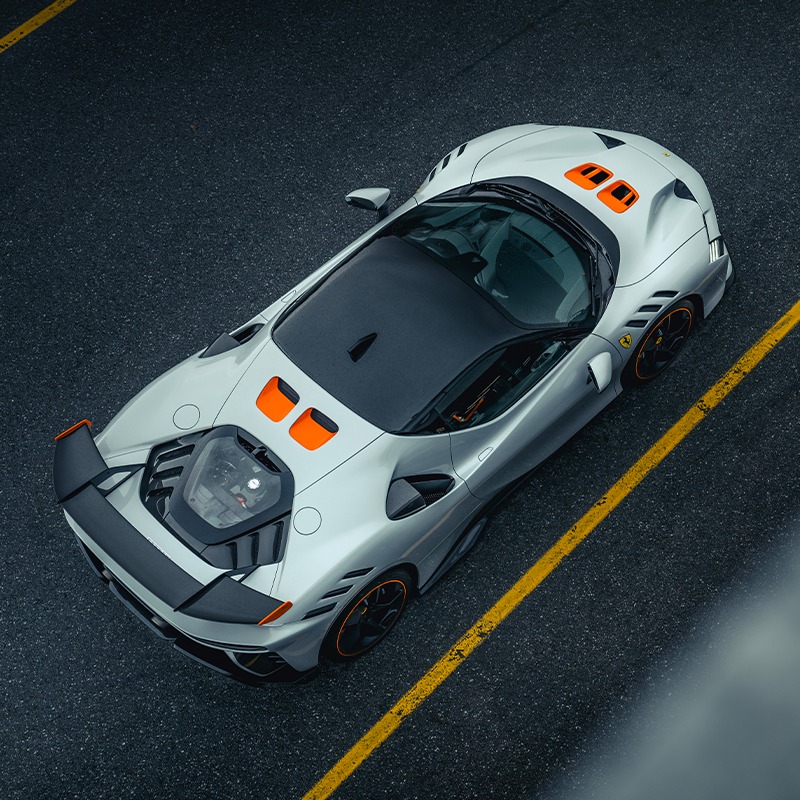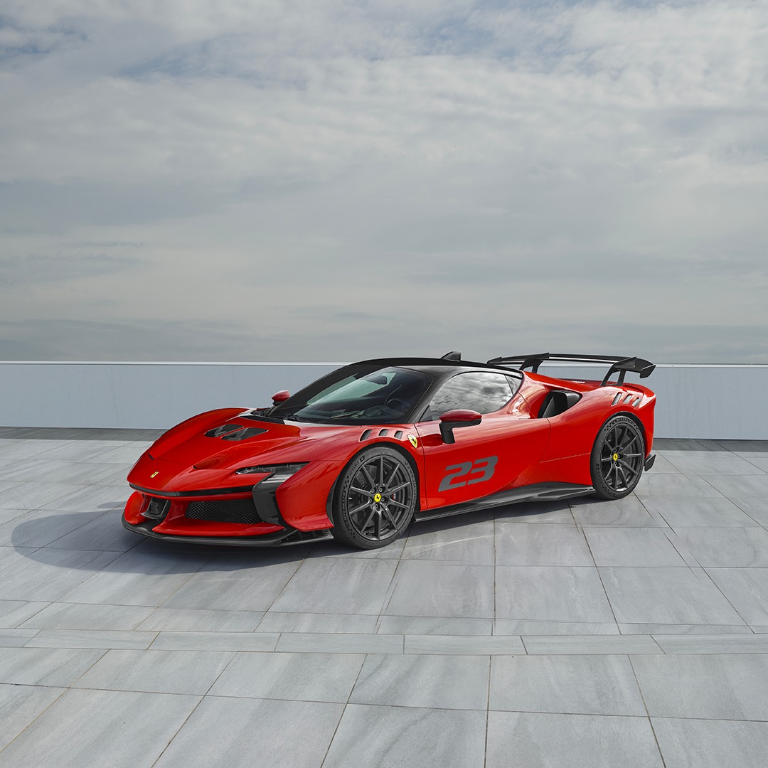 O novíssimo Ferrari SF90 XX Stradale é uma derivação concebida a partir do normal SF90 Stradale. Mais do que isso, é um novo produto XX elegível para o “Programa XX” da Corse Clienti. Mais ainda, é o primeiro modelo XX road legal, ou seja, totalmente apto para circular nas estradas públicas! Como cartão de visita, para além do agressivo pack aerodinâmico, o novo bólide debita 1030 cv de potência (mais 30 cv do que o normal SF90 Stradale) e consegue acelerar de 0 a 100 km/h em apenas 2.3s e dos 0 a 200 km/h em apenas 6.5s (menos 2 décimas de segundo do que o modelo normal em ambos os campos), ainda que seja apenas 10 kg mais leve face ao modelo que lhe serve de base. A velocidade de ponta, essa sai prejudicada, pois regista “apenas” 320 km/h, valor que é 20 km/h menor do que na pura versão de estrada, devido à adoção do agressivo pack aerodinâmico, capaz de gerar 530 kg de downforce, mais 140 kg do que a versão “mille cavalli”. A par da versão de carroçaria Stradale, foi também lançada a versão Spider (com base no SF90 Spider normal), com o tejadilho amovível, que na posição de habitáculo fechado é praticamente igual ao Stradale, a não ser pelo facto de possuir duas “bossas”. Por convenção apenas farei referências à versão Stradale. Para melhor conhecermos este novo “potro”, vamos esmiuçar todos os detalhes que fazem dele o mais forte concorrente do Lamborghini Revuelto e é, até ao momento, a versão de estrada mais potente de sempre da história da Ferrari, apesar de não apostar na arquitetura V12 atmosférica.