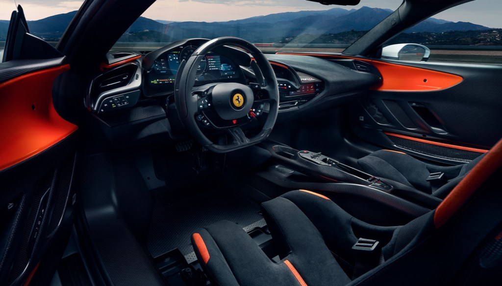 No interior não podiam faltar uns exclusivos assentos de corrida específicos com uma estrutura tubular visível em fibra de carbono com suportes de almofada que foram projetados para o SF90 XX Stradale para aumentar o prazer de conduzir e/ou pilotar sem comprometer o conforto. O mecanismo de inclinação do encosto foi integrado ao assento através de materiais de acabamento elástico que ocultam a separação entre o encosto e o assento. Isso significa que a estrutura parece perfeita em todos os momentos – assim como um assento de peça única, permitindo também que o encosto seja ajustado à altura dos ocupantes. Juntamente com a estrutura de fibra de carbono, esse recurso economizou 1.3 kg de peso em comparação com os assentos de peça única do SF90 Stradale puro.