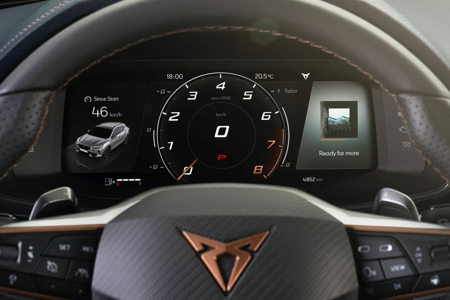 O CUPRA Formentor é dotado de modos de condução comandados pela magia da eletrónica – que influenciam a configuração da suspensão, do tato dos travões, da sensibilidade dos pedais e do rugido do motor -, mas é só a partir da sub-gama VZ que o modo CUPRA está disponível. No caso do Formentor VZ5, para além dos modos Confort, Sport, CUPRA e Individual, existem dois modos suplementares que não podem ser utilizados em estradas públicas: o modo Offroad, indicado para pisos de terra ou cobertos de neve, e o delicioso modo Drift, que configura o sistema de tração às quatro rodas Quattro (ei, desculpem… 4DRIVE) para drifts poderosos e espetaculares, mas apenas indicado para pistas desenhadas para o efeito. Complementando a dinâmica tão característica da gama Formentor, em nenhum momento pode ser dispensado o sistema de direção assistida eletromecânica com direção progressiva, que transmite sensações de plena segurança e poder a qualquer condutor que coloque a sua estrutura humana nos bancos desportivos, contando que se deixe imergir pelo espírito da CUPRA Tribe.