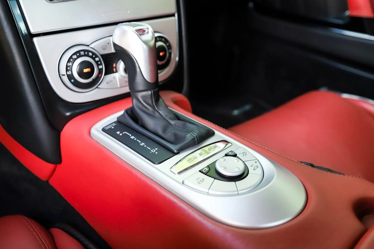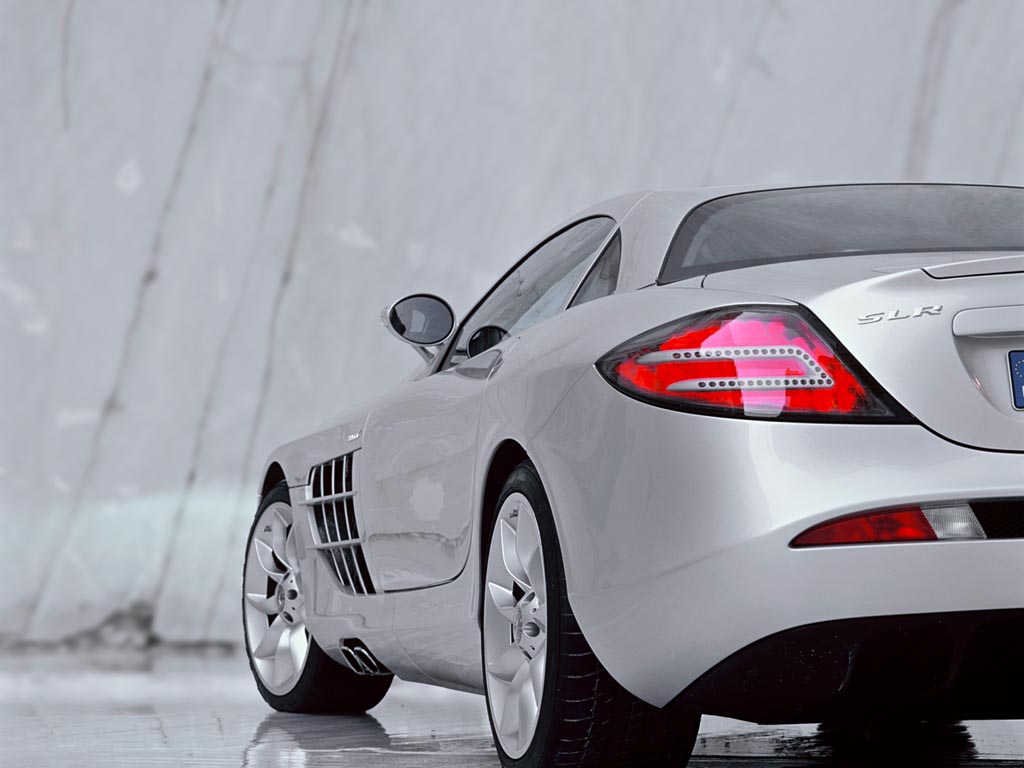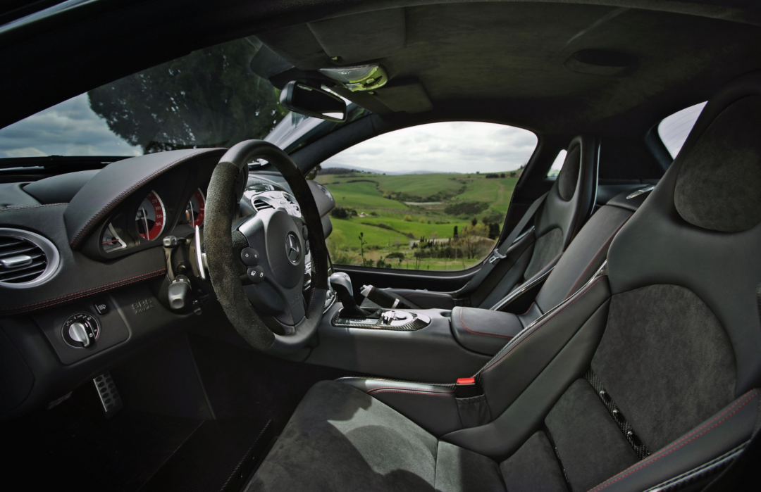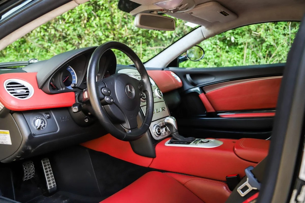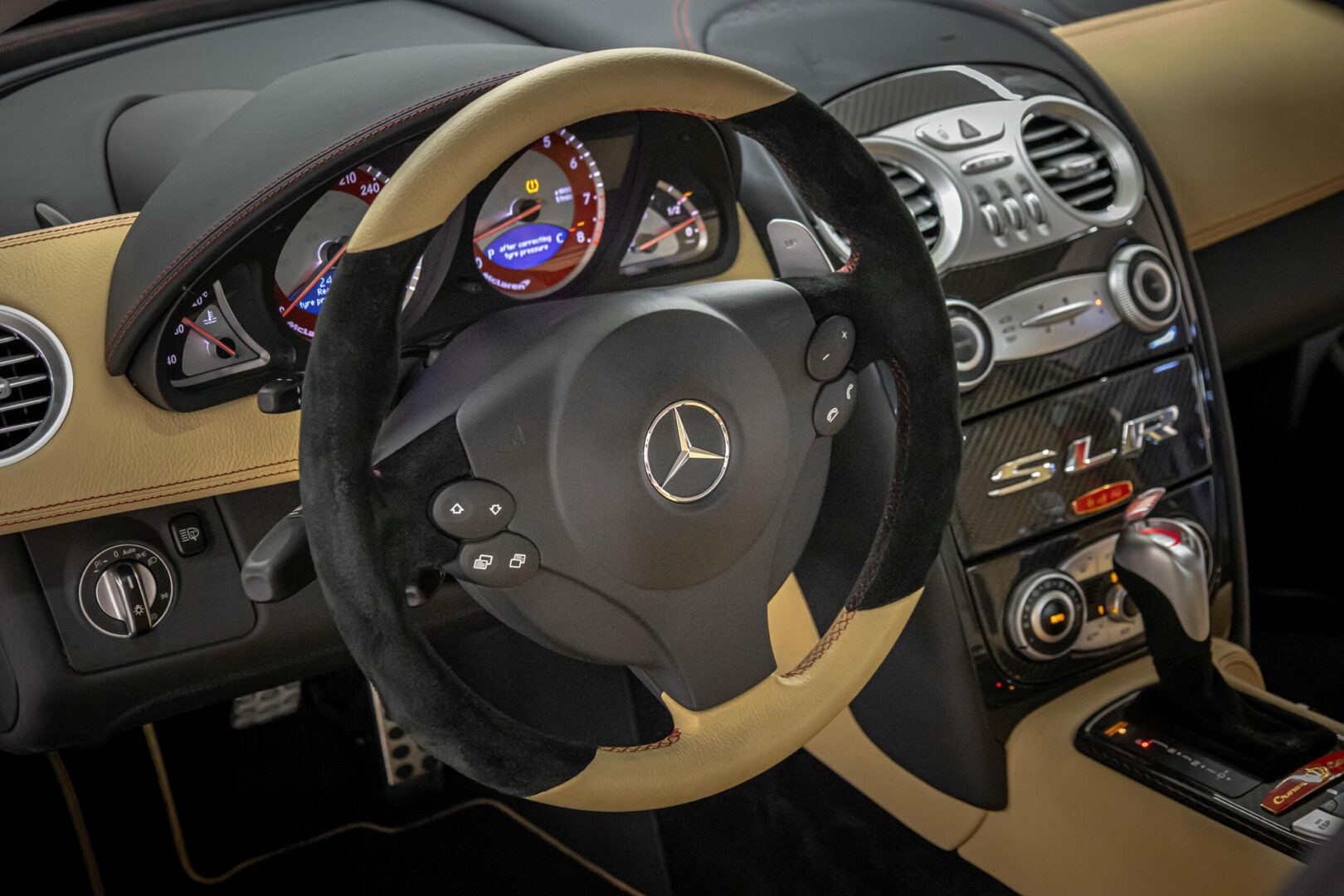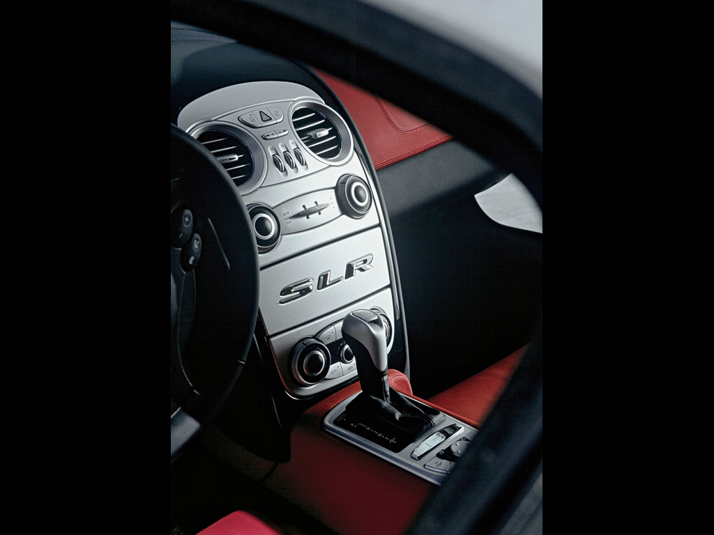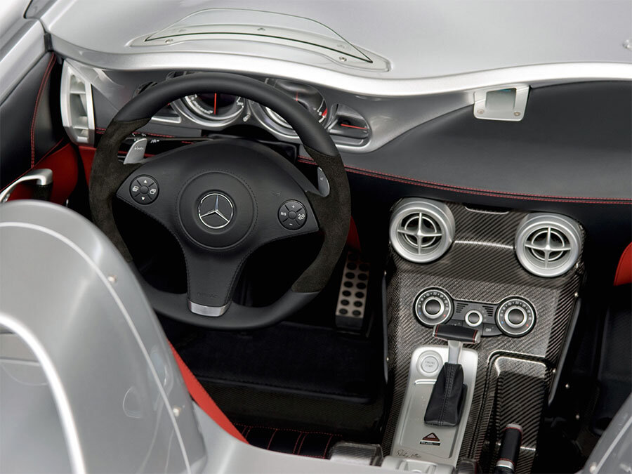 A versão definitiva do SLR McLaren standard – na cor dominante de prata – ganhou ainda outro elementos distintivos, tais como: as duplos escapes laterais em alumínio, mesmo debaixo das “guelras” amparadas por “flechas de prata”; as jantes em formato de hélice de avião; o difusor traseiro embutido na carroçaria de cor preta; as entradas de ar do para-choques dianteiro com dois suportes centrais curvados e orientados de forma simétrica fazendo lembrar aqueles que seguravam as asas dianteiras dos F1 daquele tempo (pessoalmente, gostei mais da proximidade realista destes suportes no Vision SLR); os duplos faróis redondos frontais que eram utilizados noutros carros de série da Mercedes-Benz; os farolins traseiros vermelhos com as luzes dos indicadores de direção fixadas numa estrutura prateada em forma de “C”; os faróis de nevoeiro e de marcha-atrás inseridos simetricamente, abaixo dos farolins traseiros, numa abertura curva de dissipação de ar com uma placa metálica perfurada no centro; o spoiler embutido na carroçaria que pode ser acionado de forma manual ou automática para garantir melhor downforce e ajudar um carro a travar melhor em alta velocidade; os estilosos bancos em forma de bacquet; diversas opções de personalização do estiloso interior, com couro, alcantara ou uma combinação de ambos os tipos de tecido e ainda várias cores ou combinações de cores; o revestimento de partes do interior em fibra de carbono; por fim, o pormenor delicioso do interior, o comando da caixa automática de cinco velocidades Speedshift R da AMG que esconde, através de uma tampa metálica localizada no topo do comando que se levanta manualmente, o botão mágico “start/stop engine”, como se de um caça de tratasse.