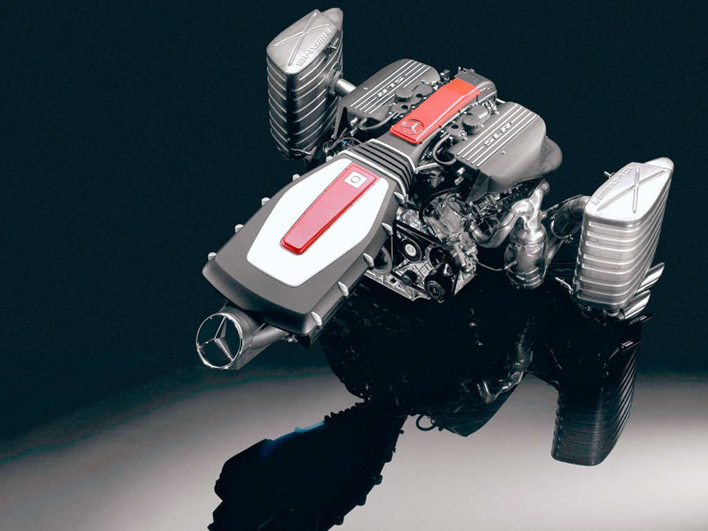 A versão final do motor V8 – fixado em posição longitudinal e sobrealimentado através de um supercompressor auxiliado por dois intercoolers – viu a sua cilindrada ser aumentada para 5439 cc e o ângulo entre as duas bancadas de cilindros fixado em 90º, com todos os exemplares a serem montados integralmente à mão pela AMG, a divisão de alta performance oficial da Mercedes-Benz que começou como preparador independente em 1967 (atualmente 100% subsidiária de alta performance da Mercedes-Benz AG, Mercedes-AMG). Cada cilindro possui três válvulas SOHC, com diâmetro e curso de 97 mm x 92 mm e uma taxa de compressão de 8.8:1. Pelo facto de ser construido totalmente em alumínio, o motor pesa apenas 232 kg, sendo lubrificado através de um sistema de cárter seco. O supercompressor é de parafuso duplo do tipo Lysholm e gira a um máximo de 23 mil rpm, produzindo 0.9 bar de impulso; o ar comprimido é depois arrefecido através de dois intercoolers. Na versão standard, o motor V8 AMG produz uma potência máxima de 626 cv às 6500 rpm e um binário máximo de 780 Nm entre as 3250 e as 5000 rpm, com a força motriz a ser transmitida unicamente ao eixo traseiro. Face ao concept car, a posição do motor foi movida um metro para trás, 50 cm atrás do eixo dianteiro, o que melhorou significativamente a distribuição de massas. Conjugando o peso (algo) pluma do bólide com as caracteríticas técnicas do motor – mais o desempenho da caixa automática de cinco velocidades Speedshift R da AMG com três modos manuais – o SLR McLaren acelera de 0 a 100 km/h em apenas 3.8 s e atinge uns estonteantes q.b. 334 km/h de velocidade máxima. A Mercedes-Benz tinha a opção de colocar uma transmissão de sete velocidades, mas por questões de durabilidade e pelo facto de a transmissão de sete velocidades conter mais peças, não o quis fazer. Compreende-se, tendo em conta que o Mercedes-Benz SL55 AMG possuia o mesmo motor e a mesma transmissão de cinco velocidades.