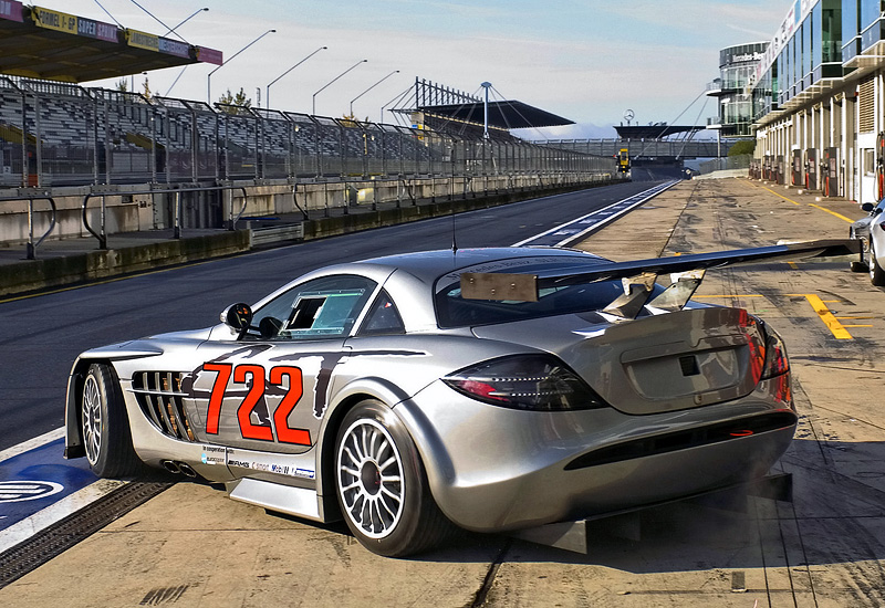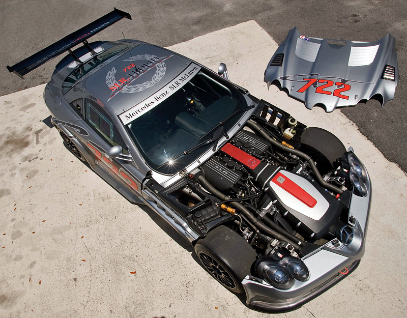 Também em 2007, foi lançada a versão de corrida “722 GT” do SLR 722 – série limitada de 21 unidades – para uma competição de várias corridas monomarca denominada SLR Club, a qual foi construida pela Ray Mallock Ltd. com a aprovação da Mercedes-Benz para satisfazer os pedidos dos entusiastas. A carroçaria é mais larga para acomodar as jantes de corrida OZ de 18”, ao passo que os característicos ventiladores da grelha dianteira foram removidos e no capô encontram-se agora uns mais largos extratores do fluxo livre de ar que flanqueiam as laterais do bólide. A secção traseira possui uma asa de downforce fixa e um difusor mais pronunciado. O carro “emagreceu” 398 kg e apresenta agora um peso em seco de 1390 kg. O motor mantem praticamente as mesmas especificações de fábrica, mas foi programado para gerar uma potência maior, de 680 cv, resultando num binário de 830 Nm a 1.75 bar de impulso, estando ainda equipado com um novo filtro de competição e um novo sistema de escape. No que respeita à dinâmica, o 722 GT possui um novo conjunto de suspensões de corrida Eibach modificadas com um estabilizador dianteiro modificado que melhora o manuseamento. O sistema de suspensão pode ser configurado para diferentes circuitos, através do ajuste do camber das rodas juntamente com amortecedores com configurações variáveis de compressão e descompressão. As novas jantes de competição OZ de 18” possuem porcas de fecho central que permitem trocas de pneus mais rápidas, auxiliadas por um sistema de macaco pneumático. O sistema de travagem carbocerâmico de série foi substituído por um sistema de travagem de competição aprovado pela FIA constituido por discos de travão em aço com sistema de arrefecimento e equilíbrio modificados que garantem uma melhor potência de travagem. Mantem-se o mesmo sistema de transmissão, mas agora adaptado para corridas. O interior é despojado, mantendo-se apenas as funções essenciais controladas a partir de uma bitácula de fibra de carbono. O volante de série foi substituido por um volante de competição com patilhas e um indicador de mudança de velocidades; os bancos de couro aquecidos por sua vez foram também substituidos por bancos de corrida da Recaro com arnês de corrida de seis pontos; o painel de instrumentos de série foi removido e foi colocado em seu lugar um display de corrida digital. A transformação fica completa com novos paineis das portas em fibra de carbono, janelas em plexiglass e a indispensável roll cage.