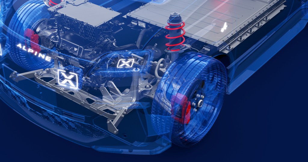 O novo A290 utiliza uma plataforma específica para veículos 100% elétricos, neste caso a AmpR Small, em forma de skate, que teve o objetivo de promover a mobilidade elétrica automóvel em modo desportivo. Tem a particularidade de, para além de baixar o centro de gravidade, otimizar a distribuição de peso e, neste caso específico, reduzir o peso no eixo dianteiro, em boa parte graças à dimensão fina da bateria, com benefícios para o espaço interior. Isto deu espaço para reduzir a secção frontal do modelo e para manter a distância entre eixos curta, ao passo que deu ainda margem para aumentar a largura das vias, para uma utilização de pneus maiores e, consequentemente, maior tração rolante nas curvas. Os engenheiros puderam, pois, colocar um motor elétrico proveniente do segmento superior – tal como Jean Rédélé fez com o motor do seu 4CV (colocou-lhe um turbo) transformado no primeiro Alpine da história, o A106 -, assim como acrescentar um sistema de suspensão exclusiva, travões específicos, pneus dedicados e gestão do binário, e claro está, uma afinação mais desportiva. Resultado? Aceleração de 0 a 100 km/h de 6,4 segundos, potência máxima de 220 cv e 300 Nm de binário. Mas… um desportivo não seria desportivo se não fosse prático (e seguro), e até nesse ponto a equipa de fábrica esteve de parabéns, ao garantir uma excelente habitabilidade nos 3 lugares traseiros, uma generosa capacidade da bagageira, cifrada em 326 litros, e um raio de viragem de apenas 10,20 metros. Mas não é tudo! Foi também criado um subchassis de motor especial, em alumínio, para melhorar o posicionamento do motor elétrico, mas também a manobralidade e uma filtragem mais apurada de irregularidades do piso. O reduzido tamanho da bateria (ficar ainda mais pequena do que está seria irrealista) contribui para uns modestos 1.479 kg, registo que, não sendo o ideal, é bom quanto baste para uma excelente dinâmica do carro. O facto de toda a suspensão utilizar batentes hidráulicos é uma mais-valia para um comportamento mais equilibrado do carro, o que juntamente com o baixo centro de gravidade, faz com que o A290 praticamente “deslize sobre carris”. Uma novidade deliciosa – que na realidade não é nenhuma novidade na história da Alpine, é a utilização de uma suspensão traseira multibraço que faz com que as rodas traseiras praticamente não oscilem da sua posição vertical em relação ao solo. Num desportivo de renome, não podiam faltar as barras estabilizadoras, colocadas na dianteira, mas também na traseira, tornando o comportamento do carro ainda mais divertido ao ponto de se poder explorar as curvas no limite da aderência, sem o mínimo perigo de derrapagem… a não ser que não seja o condutor certo para o A290, sobretudo se não souber tirar partido do sistema de travagem, cuja sensibilidade do pedal do travão foi melhorada, sendo a travagem controlada não por via mecânica, mas sim através de um sistema by-wire, que controla também a transição entre a travagem hidráulica e a travagem regenerativa, esta última nivelada através do botão rotativo Recharge montado no volante. Para uma condução mais ao gosto do condutor de acordo com as suas necessidades quotidianas (e uma melhor gestão do binómio razão/emoção), existe quatro modos de condução criados pela Alpine: ‘Save’, ‘Normal’, ‘Sport’ e ‘Personal’. Este último permite o ajuste independente do nível de assistência à direção, da resposta do acelerador, do ambiente de iluminação e do Alpine Drive Sound. Quanto ao Controlo Eletrónico de Estabilidade (ESC), este pode ser completamente desligado.