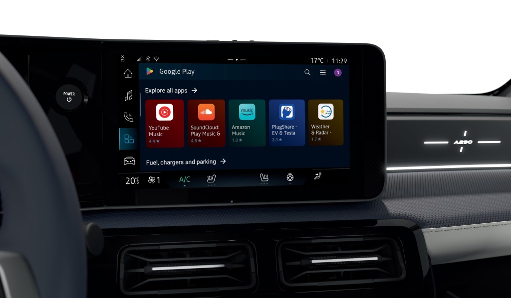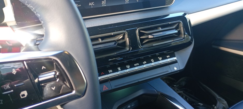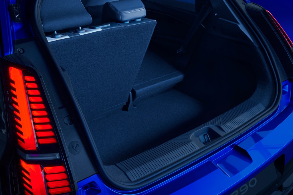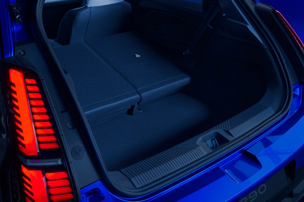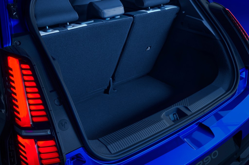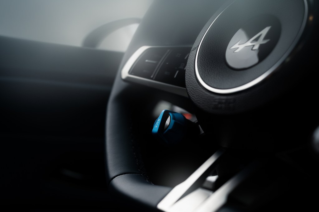 O interior do A290 partilha muito do seu design com o seu irmão gémeo Renault 5, à semelhança com o exterior, contudo o revestimento e até detalhes exclusivos da Alpine que são comuns ao modelo A110 criam todo um ambiente de competição, ao mesmo tempo que elevam a qualidade para um nível de desportividade premium. O primeiro grande destaque vai para a cor escolhida para o revestimento do interior, denominada ‘Deep Blue’, que encaixa na perfeição no ambiente alpino que o carro pretende transmitir. O condutor pode desfrutar em pleno de um cockpit que lhe atrai os sentidos para uma condução bem animada, enquanto que o espaço reservado para o passageiro possui no tablier uma retroiluminação do nome do modelo, sendo ambos os lados complementados com uma iluminação ambiente ajustável. O moderno e esculpido volante desportivo de três raios (de aspeto semelhante do A110), com o ponto central achatado, é revestido de couro Nappa, com um amplo arco de volante para uma melhor aderência; inclui vários botões específicos em alumínio inspirados no mundo das corridas de F1, com o botão rotativo RCH (para Recharge) à esquerda, para definir o nível de regeneração, os vários modos de condução à direita e o botão vermelho OV (para Overtake) imediatamente reconhecível acima. O volante inclui ainda comandos para ajudas à condução, telefone, assistente de voz e modo de visualização de instrumentos. Existe também um pod de controlo de áudio personalizado, uma evolução feliz de um “apêndice” que não é mais do que já estamos habituados a ver em todos os modelos do Grupo Renault desde finais do século XX! Não podiam faltar os pedais desportivos e um apoio para os pés a condizer, para completar o cockpit do condutor. Outra reminescência do neoclássico A110 é a consola central alta entre os dois bancos dianteiros que incorpora os controlos de transmissão em forma de três botões redondos de toque que compõem a sigla RND (R=rear, N=neutral e D=drive); cada detalhe desta área foi cuidadosamente “esculpido”, com o nome do carro gravado no apoio de braço central, o acabamento Alpine ‘Snowflake’ no compartimento da chave e a consola revestida em couro Nappa de alta qualidade. Completando a ergonomia de condução desportiva do A290, encontra-se no enorme painel de instrumentos o ecrã central de 10,1 polegadas, inclinado para o condutor, e os controlos físicos do ar condicionado que podem ser ajustados sem tirar os olhos da estrada.