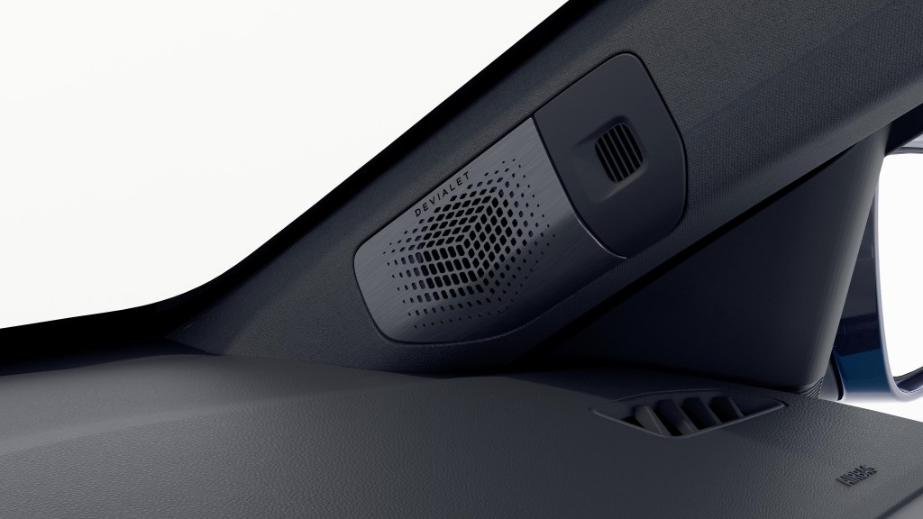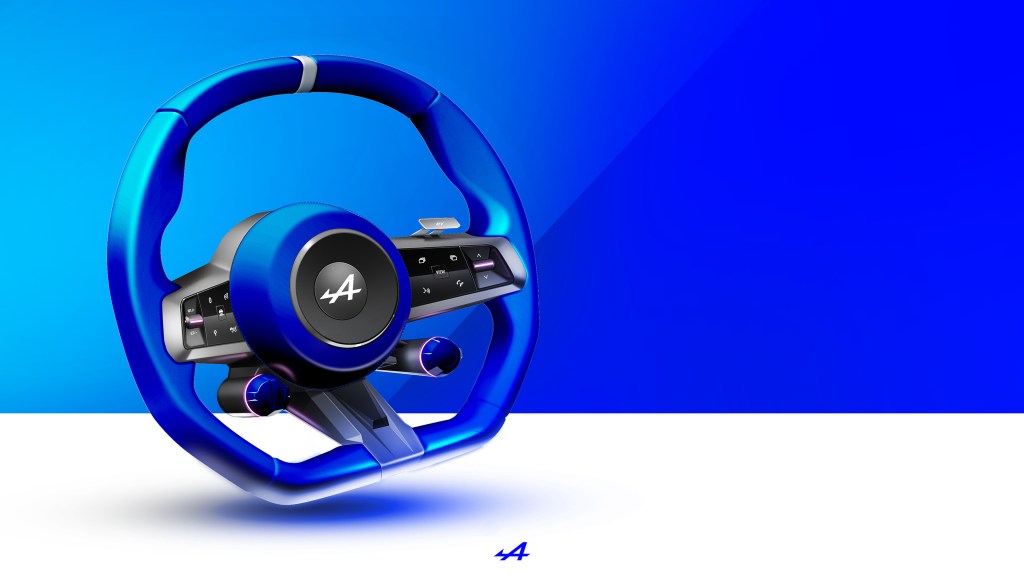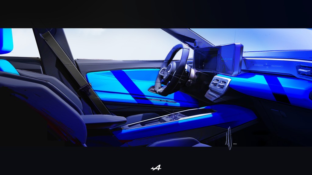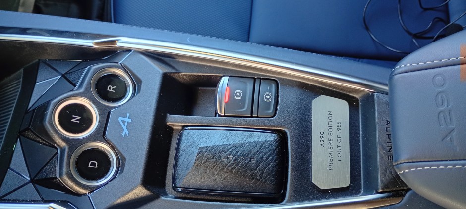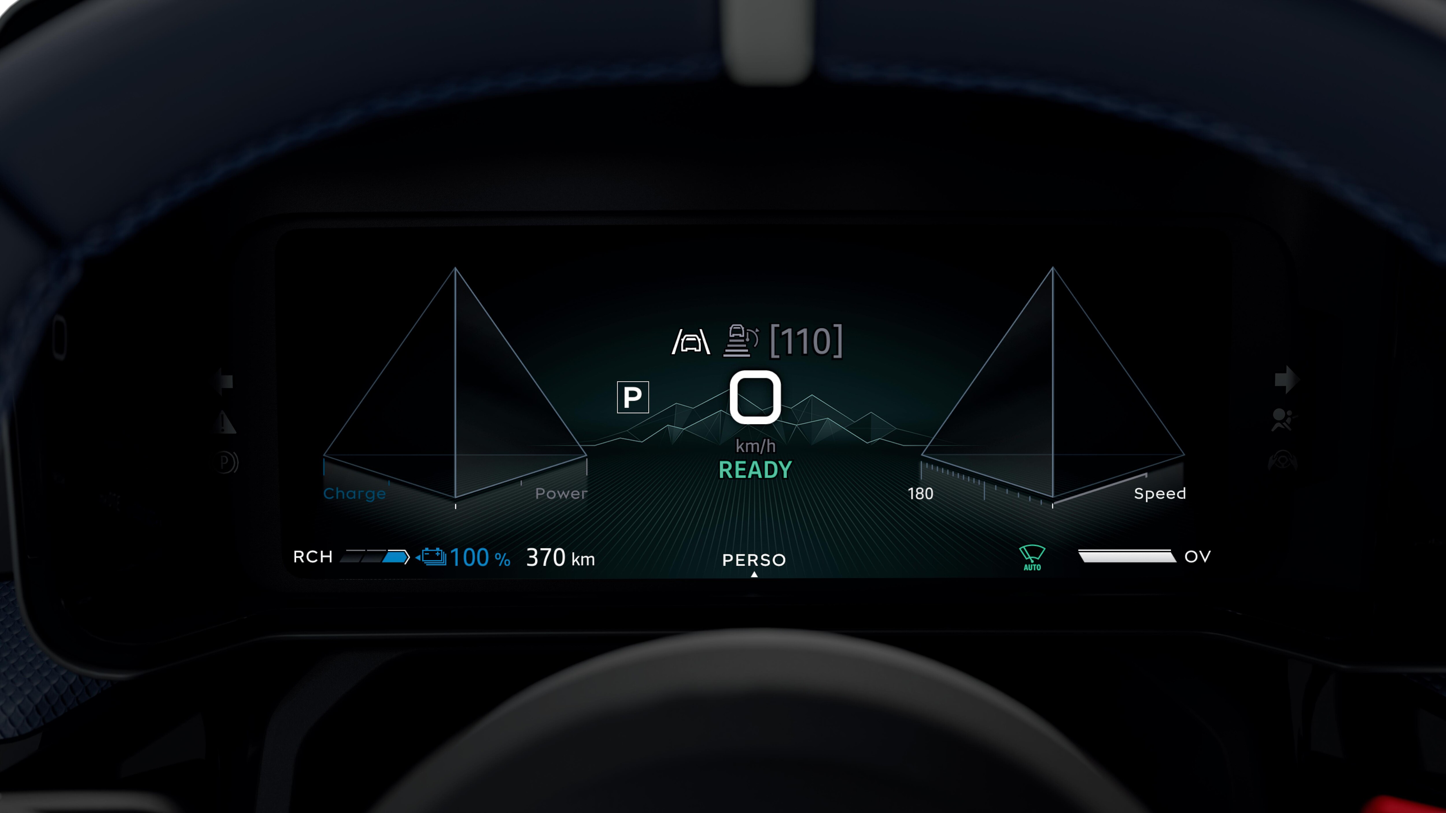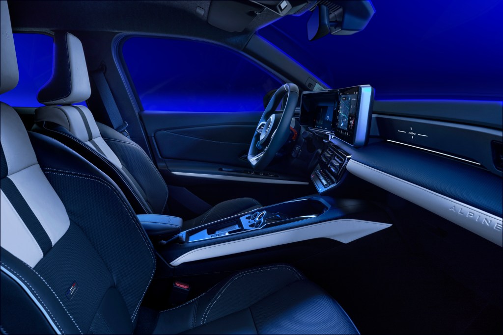 Todo o layout físico de suporte aos ‘manómetros’ digitais do A290 foi transportado do seu irmão gémeo Renault 5, sendo composto pelo painel de instrumentos de 10,25 polegadas e o ecrã central de infoentretenimento de 10,1 polegadas, este orientado para o condutor. No entanto, e (obviamente) para gláudio dos ‘alpinistas’, o grafismo, os interfaces e ainda funções específicas são exclusivas da marca premium gaulesa, tudo isto criado para uma verdadeira experiência imersiva de condução chic sportif, altamente inspirada no passado de competição da Alpine e na característica variante francesa da cor azul da tricolor bandeira da República Francesa. O painel de instrumentos, em vez dos mostradores digitais redondos, apresenta um esquema composto por triângulos desenhados por ‘fios’ altamente definidos, dentro dos quais são altamente legíveis os dados da velocidade instantânea (à direita) e do nível de potência fornecida ou recarregada (à esquerda), e ainda uma linha vermelha que simboliza os limites de velocidade decifrados pelo sistema de leitura de sinais de trânsito, enquanto que o nível de regeneração é visível na parte inferior do ecrã. A nova tipografia de exibição de velocidade é nítida e arredondada, tendo como fundo um ecrã azul com silhuetas de montanhas, uma das imagens de marca da Alpine.