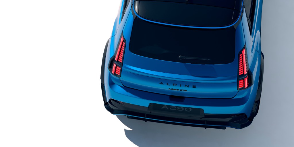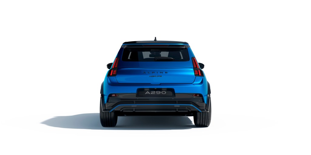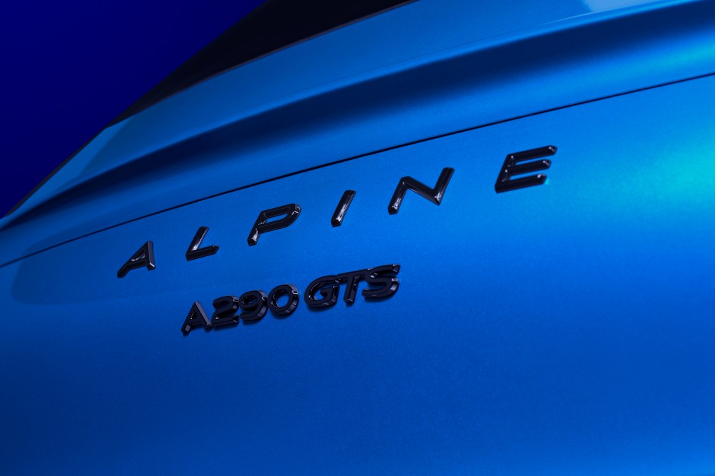 Exteriormente, o novo A290 apresenta um aspeto musculado, face às suas dimensões compactas que apresenta: comprimento de 3.990 mm, largura de 1.820 mm, altura de 1.520 mm e distância entre eixos em 2.530 mm. A isso acresce – face ao “normal” Renault 5 E-Tech – um alargamento das vias em 60 mm, para uma melhor aderência em estrada e pista, mas também para uma presença visual mais distinta e desportivamente mais assertiva. Assim, o A290 ganha um carácter distinto, tal como todos os modelos Alpine anteriores. A sua personalidade é reforçada pela assinatura luminosa única, reconhecível de longe e composta por quatro faróis dianteiros (uma imagem de marca da Alpine), com motivos em forma de X com reminiscência nos antigos Alpine de rali, exibindo automaticamente uma animação de boas-vindas assim que o cartão mãos livres é detetado quando o condutor se aproxima; mas também pelos guarda-lamas largos, as saias laterais que incorporam um subtil rebordo na cor da carroçaria, a borda do tejadilho em alumínio (ou azul anodizado de série em versões específicas), a bandeira francesa (opcional) no pilar C, a antena preta de tubarão (de série), os logótipos das asas (dependendo da versão), o contorno da carroçaria e as asas lacadas a preto, a linha distinta que anima a porta traseira e, por fim, o difusor no para-choques traseiro. Na frente, está escrito o nome Alpine, e um típico motivo de floco de neve está integrado no exclusivo para-choques já de si desportivo.