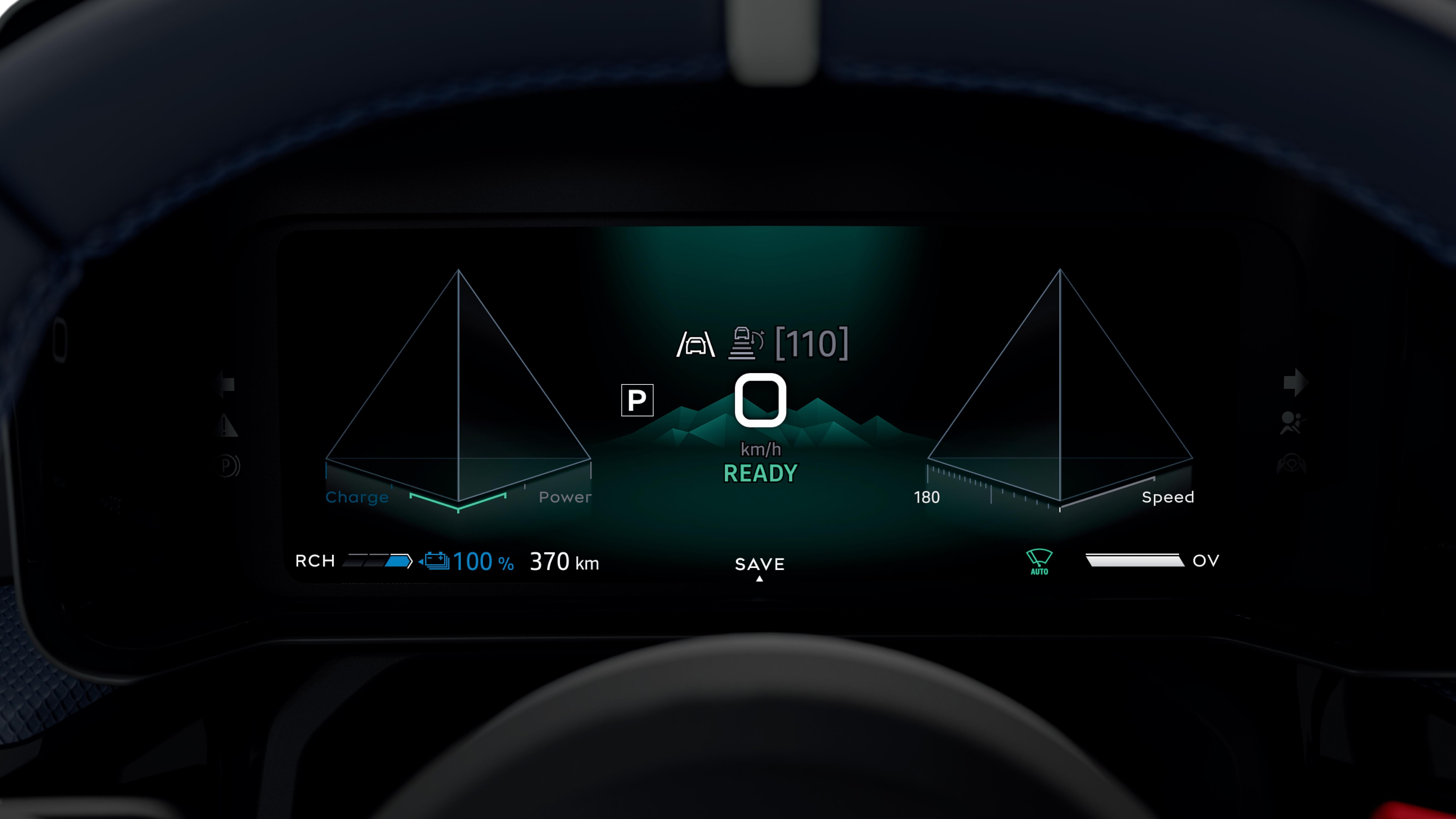 Há quatro tipos de esquema de visualização: o ‘Iconic’, com os dois triângulos a incorporar as funções do medidor de potência e do tacómetro, indicando respetivamente a potência e a velocidade instantânea; o ‘Navigation’, que dá primazia à instrumentalização da navegação através do Google Maps, o ‘ADAS’, que mostra a distância de segurança em relação ao veículo da frente exibindo o A290 na cor da carroçaria com animações dos indicadores e das luzes de travagem; por fim, o ‘Minimal’, que mostra as informações básicas. Dependendo do modo de condução escolhido, indicado na parte inferior do velocímetro, o fundo do visor altera o seu tema visual geral: ‘Norma’l, ‘Sport’ (a linha de cume da montanha fica vermelha), ‘Save’ (a montanha toma tons esverdeados) e ‘Personal’.